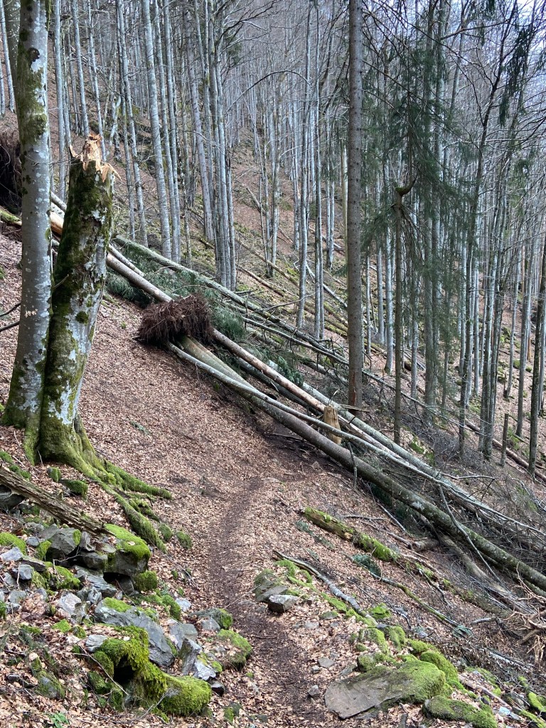 Nun ging es auf einem steilen, schmalen Pfad wieder bergauf. Innerhalb von ein paar Kilometer stiegen wir über 200 Höhenmeter hinauf. Auf dem Weg mussten wir über ein paar umgestürzte Bäume klettern. Trittsicherheit und ein festes Schuhwerk ist bei der Wanderung, vor allem bei Nässe, ein absolutes Muss.