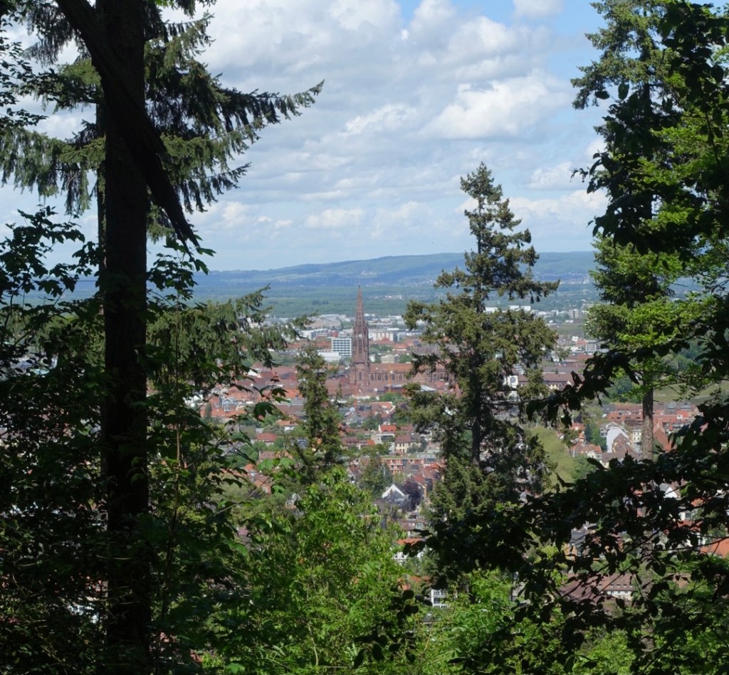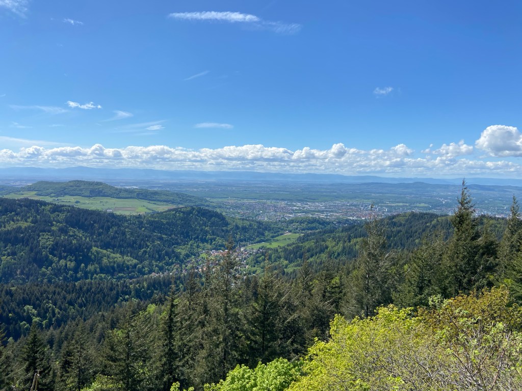 Nach ca. 4 Kilometer erreichten wir den auf 669 Meter hoch gelegenen Aussichtspunkt „Zwei Birken“. Von dort hat man schon eine tolle Aussicht auf Freiburg und die Rheinebene. Ein kleiner Grillplatz lädt zudem zu einer kurzen Rast ein.