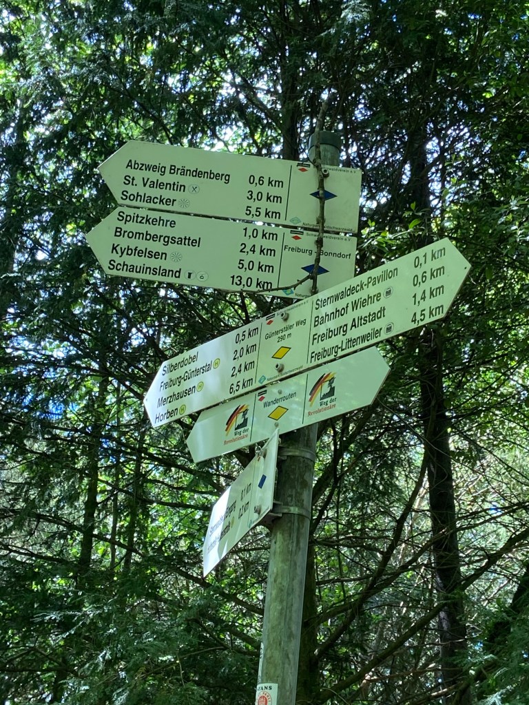 Wir starteten bei sonnigen, aber windigen 16 Grad im Freiburger Stadtteil Wiehre und folgten dem regionalen Wanderweg Freiburg – Schauinsland – Bonndorf, gekennzeichnet mit der blauen Raute, Richtung Kybfelsen.
