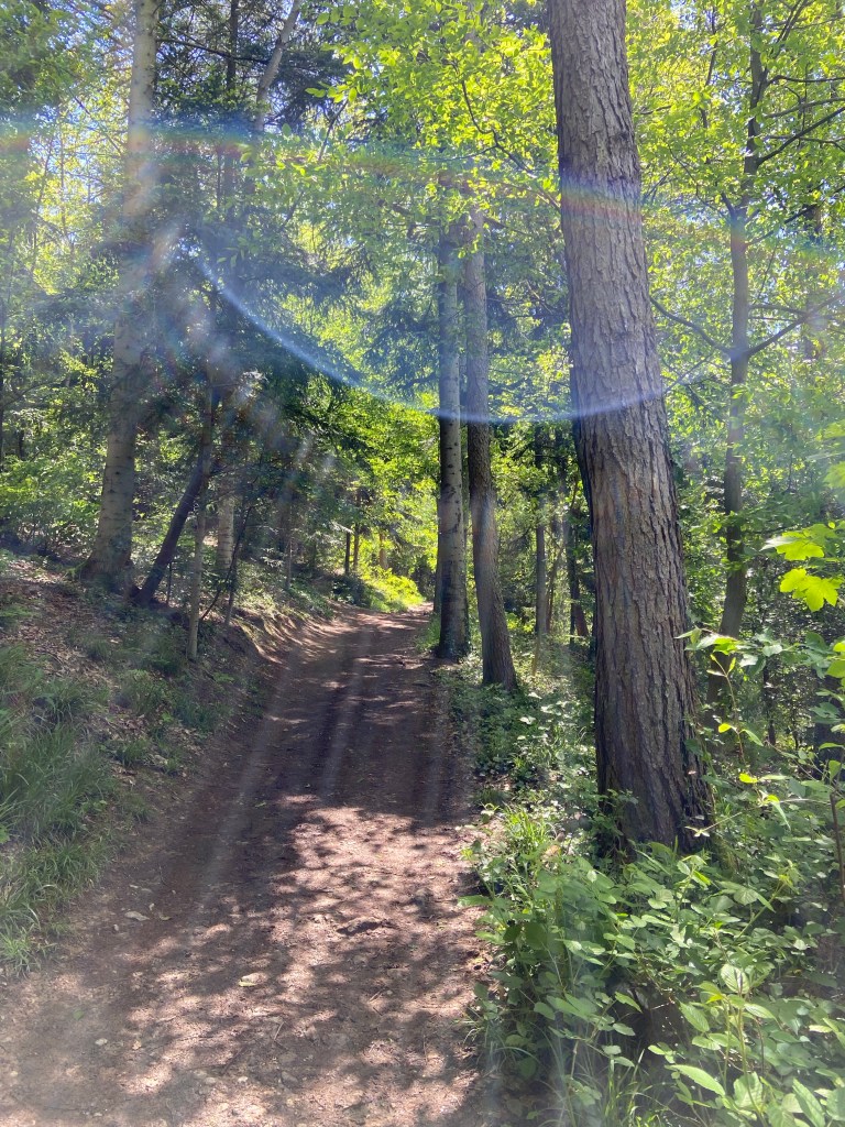 Auf schmalen, leicht steinigen Waldwegen ging es den Brombergkopf, einem 605 Meter hohen Berg im Stadtwald Distrikt I Schauinsland, hinauf. Bäume spenden den Wanderern hier an sonnig, warmen Tagen angenehmen Schatten und auf linker Seite erhascht man immer mal wieder einen schönen Ausblick auf Freiburg.