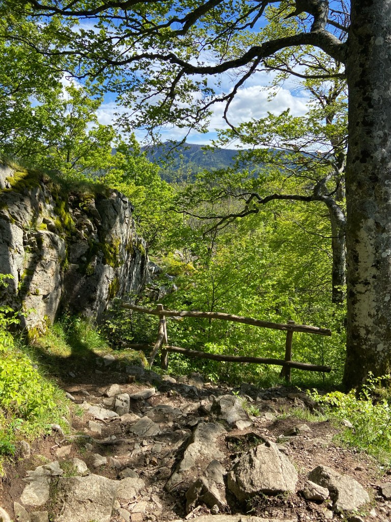 Von dort ging es entlang der Schutzhütte „Rehhagsattel“ weiter Richtung Kybfelsen. Die Schutzhütte bietet einen weitläufigen Blick in den nördlichen Breisgau mit der Stadt Emmendingen. Die letzten Meter zum Kybfelsen führten uns weiter durch den Wald auf schmalen Wegen, welche von hohen Bäumen umsäumt sind.