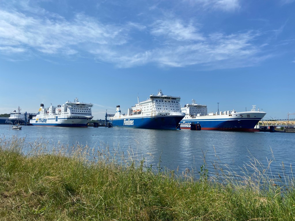Wir folgen einem Radweg entlang der Trave Richtung Süden. Auf gegenüberliegender Seite befindet sich der Skandinavienkai. Der Skandinavienkai ist der größte Fährhafen an der Ostsee. Verbindungen bestehen nach Schweden (Trelleborg und Malmö), Finnland und ins Baltikum. Imposant liegen die Fährschiffe in den Terminals vor Anker und warten auf ihre Weiterfahrt.