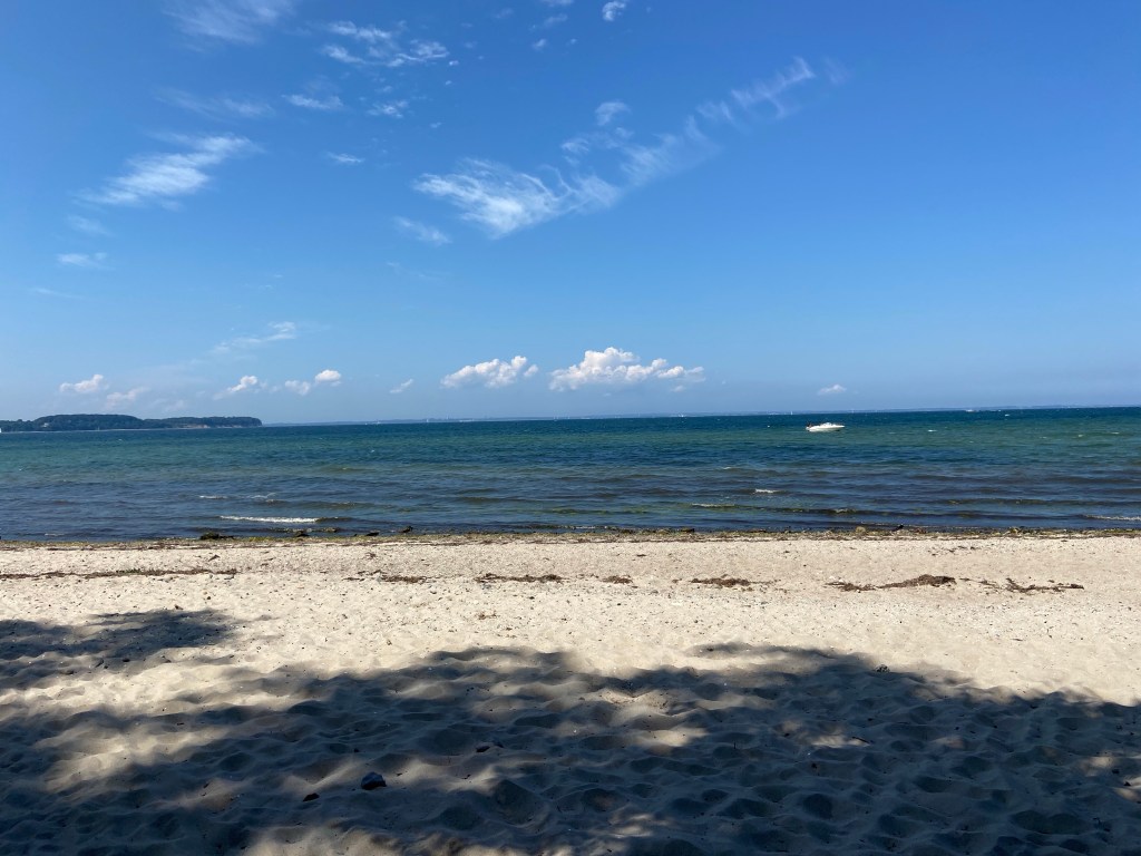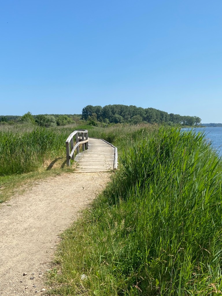 Am südlichsten Zipfel der Insel Priwall angekommen, führt uns der Weg über ein hölzernen Steg entlang der Pötenitzer Wiek. Durch ruhige, schattige Wälder kommen wir Richtung Stadtbezirk Priwall. Den Ortsteil verlassen wir jedoch schnell wieder und biegen beim Campingplatz rechts in den Wald ab. Von dort gelangen wir erneut an die Pötenitzer Wiek, wo einige Leute ihr Strandtuch ausgebreitet haben und das sonnig, warme Wetter für ein Sonnenbad nutzen.