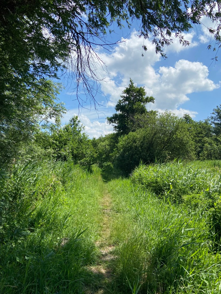 Durch eine schnucklige, gemütlich aussehende Wochenendhaussiedlung geht es weiter Richtung ehemalige innerdeutsche Grenze. In Mecklenburg-Vorpommern angekommen, führt unser Weg auf einem überwucherten Pfad entlang Richtung des Orts Pötenitz. Kniehohes Gras streift unsere Beine.