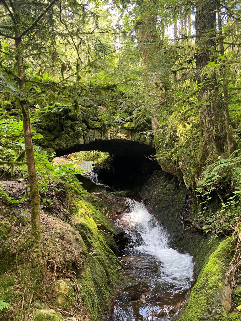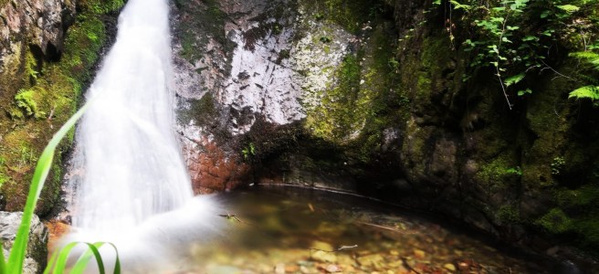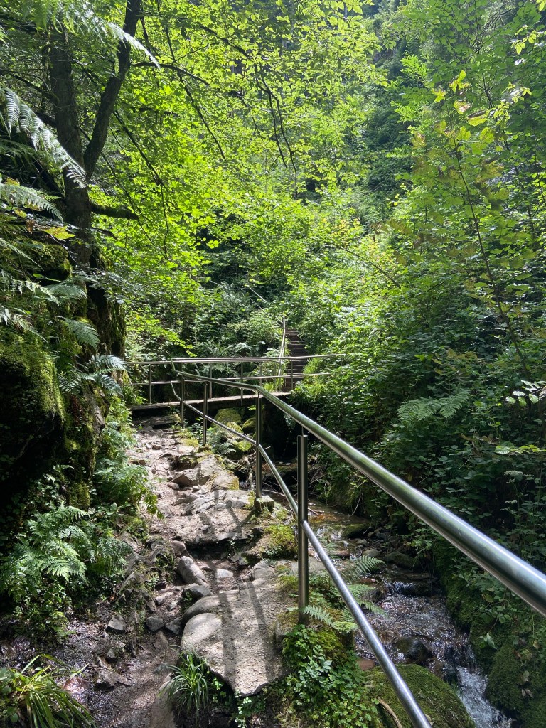 Über Treppen und Brücken geht es an den Wasserfällen aufwärts Richtung Deglerbad, vorbei an einer romantisch anmutenden Steinbrücke.