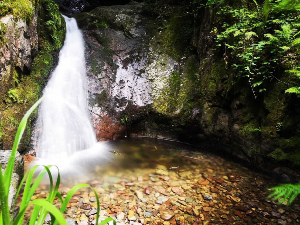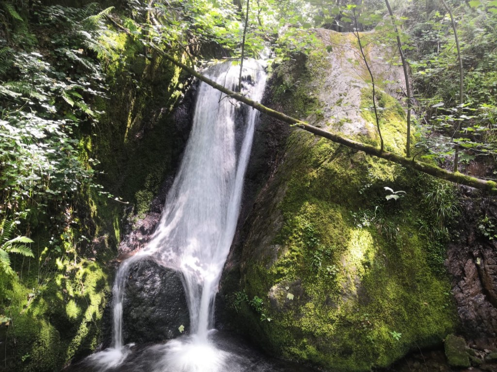 Am Bahnhof Ottenhöfen, der Endstation der Achertalbahn, starten wir unsere Tour und wandern aus der kleinen Ortschaft hinaus auf den Eichkopf. Zwischen den Stämmen des vollständig bewaldeten Bergrückens, kann man ab und an einen einen Blick auf die Terrassen des Steinbruchs Ottenhöfen werfen. Durch dichten Wald schlängelt sich der schmale Wanderweg ein Stück bergab. Unterhalb des Eichkopfs gelangen wir zum Gottschlägbach. Entlang des Baches wandern wir hinein in eine Schlucht. Die Felsen sind mit Moos und Farnen überwuchert und geben der Schlucht eine mystische Note. Wenige Schritte später erreichen wir die Wasserfälle und das Edelfrauengrad.