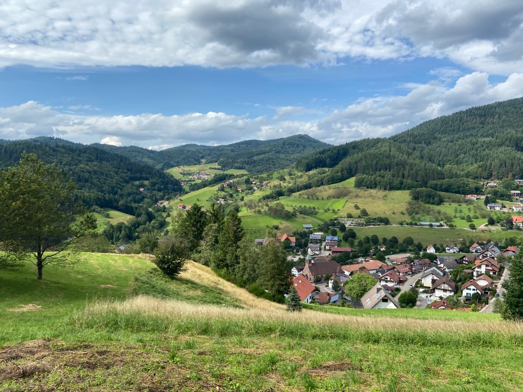 Von nun an führt der Weg entlang einer asphaltierten Straße immer weiter hinab ins Tal Richtung Ottenhöfen. Ein kleines Highlight zum Schluss der Tour bietet der Aussichtspunkt „Schau ins Land“. Dort wurde eine Holzliege installiert, auf der man einen herrlichen Ausblick auf Ottenhöfen hat. Eine gute Möglichkeit seinen strapazierten Füßen eine letzte kleine Erholung zu bieten, ehe man über eine mit Wildblumen bewachsene Wiese zum letzten Abschnitt ins Tal hinab und somit wieder zum Ausgangspunkt der Tour startet.