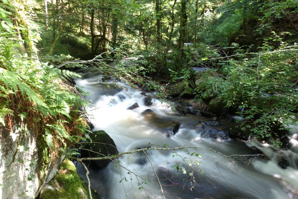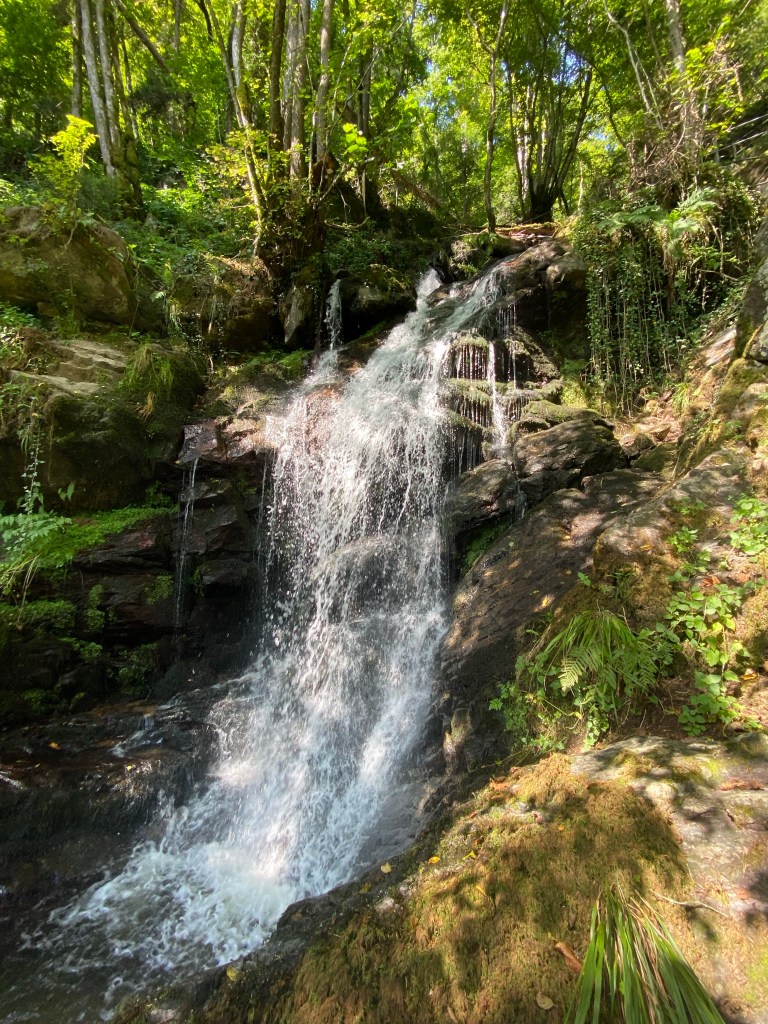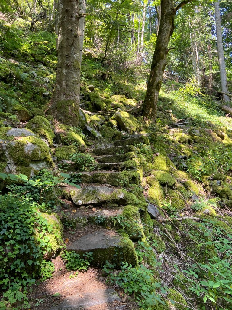 An der Murgtalbrücke angekommen, beginnt der Aufstieg zur Ruine Wieladingen. Auf steinernen Treppen geht es hier bergauf. Wir steigen den Pfad entlang der malerischen Lehenbachwasserfällen immer weiter hinauf.