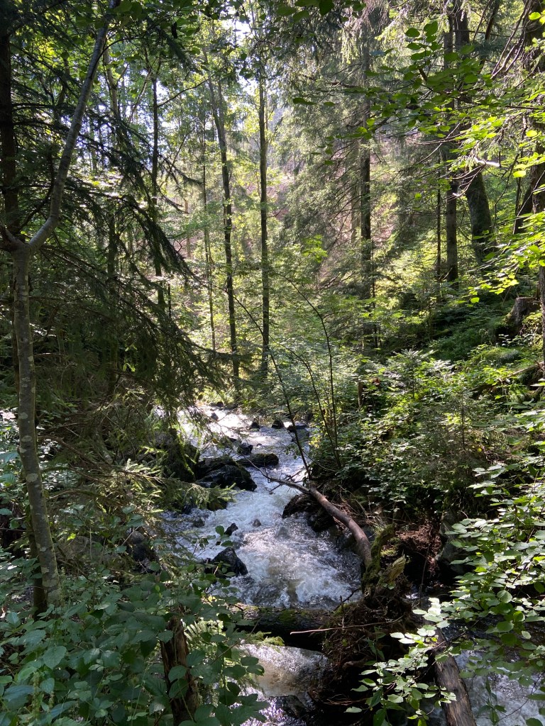 Entlang des Seelbachs geht es nun in den Wald hinein. Schon bald erklingt das typische Rauschen eines Wasserfalls und kurze Zeit später kommt auch schon der Strahlbruschwasserfalls ins Bild. Hier stürzt der Seelbach über eine zwölf Meter hohe Stufe hinunter zur Murg.