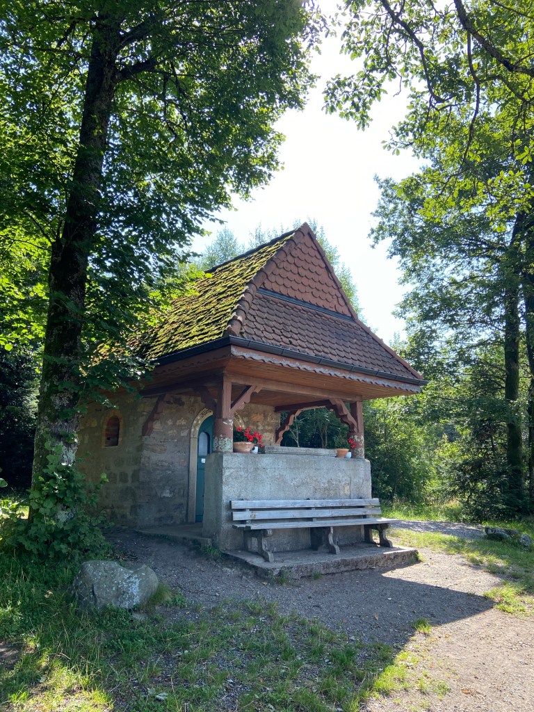 Wir biegen auf den Weg links ab und folgenden dem Forstweg bergaufwärts. Die Umleitung führt über eine schöne Anhöhe, vorbei an der Bildstöckle-Kapelle, hinunter bis zur Murgtalbrücke.
