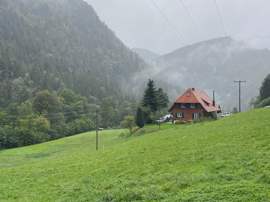 Am Küferhansenhof angekommen, folgen wir eine kurze Zeit dem Katzensteig. Von dort hat man bei gutem Wetter eine tolle Sicht ins Tal, auf die gegenüber liegenden Berge und den Schwarzwald. Heute sehen wir außer graue Wolken nichts. Tief hängen sie im Tal und sehen so aus, als ob sie dort noch eine Weile verweilen wollen.