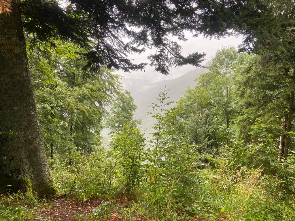 An einer Kreuzung unterhalb des Spisingerhofs biegen wir auf den Glaserschlagweg ab und folgen diesen bis zur Behaghelhütte. Der Abschnitt zieht sich aufgrund des starken Regens leider etwas in die Länge. Auf dem breiten Forstweg bieten die Bäume kaum Schutz vor den herab prasselnden Regentropfen. An der Behaghelhütte angekommen, hat man einen Blick auf den bekannten Steinwasen Park, einen Freizeitpark, der unter anderem für seine Seilbrücke und Sommerrodelbahnen bekannt ist.