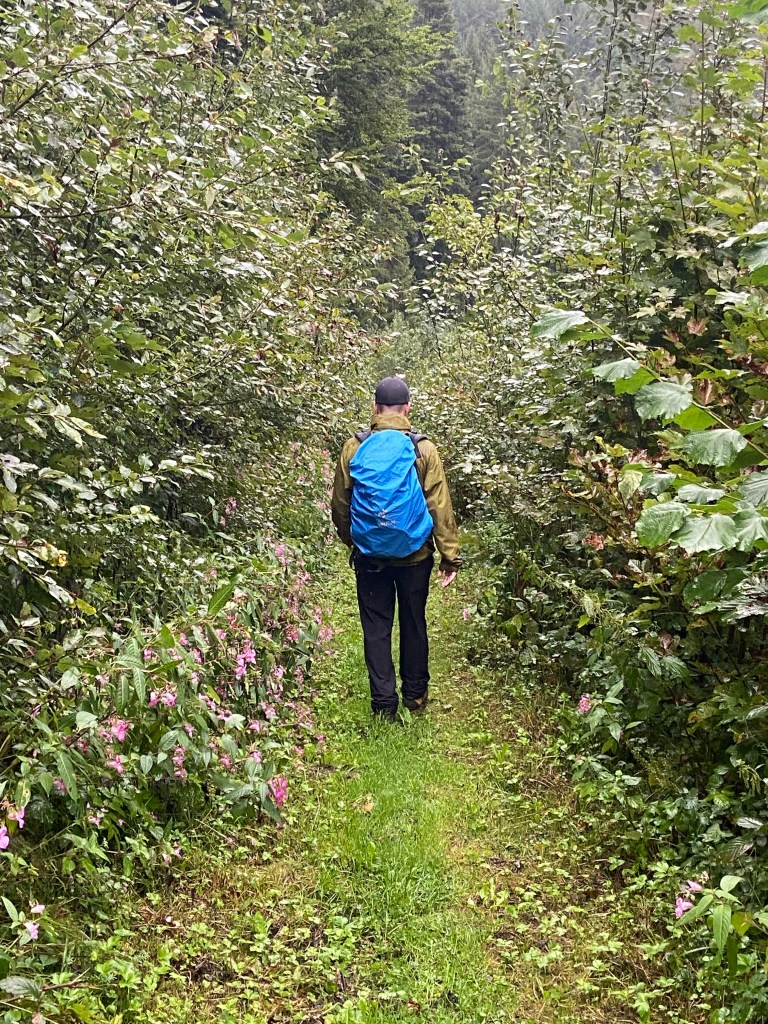 Die Wanderung führt nun entlang eines kleinen Wegs off grid den Berg hinab. Die Abzweigung ist so unscheinbar, dass wir sie tatsächlich verpasst haben. Ein Glück, dass unser GPS-Tracker rechtzeitig gemeckert hat, sonst wären wir in die falsche Richtung gelaufen. Im Zickzackkurs geht es nun immer weiter hinab. (Ungenießbare) Pilze zieren den Weg und die dort liegenden Baumstämme.