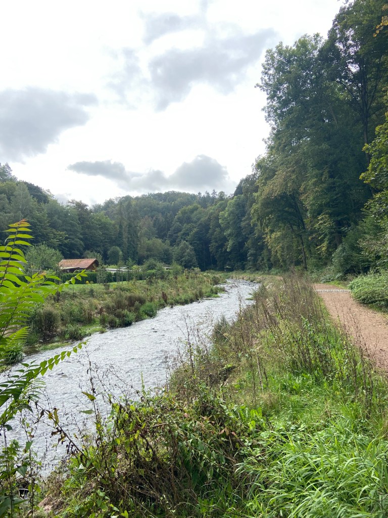 Unsere Wanderung beginnt am Bahnhof in dem kleinen Örtchen Coßmannsdorf, ein Dorf in der Nähe von Tharandt. Zuerst geht es in das nahegelegene Einkaufscenter, uum uns für unsere Wanderung zu stärken. Versorgt mit belegten Brötchen und einem Cappuccino machen wir uns auf den Weg. Nach ein paar Meter verlassen wir die Straße und wandern entlang des Flusses „Rote Weißeritz“ Richtung Somsdorfer Klamm. Während der Verkehrslärm langsam nachlässt, genießen wir die fremde Umgebung.