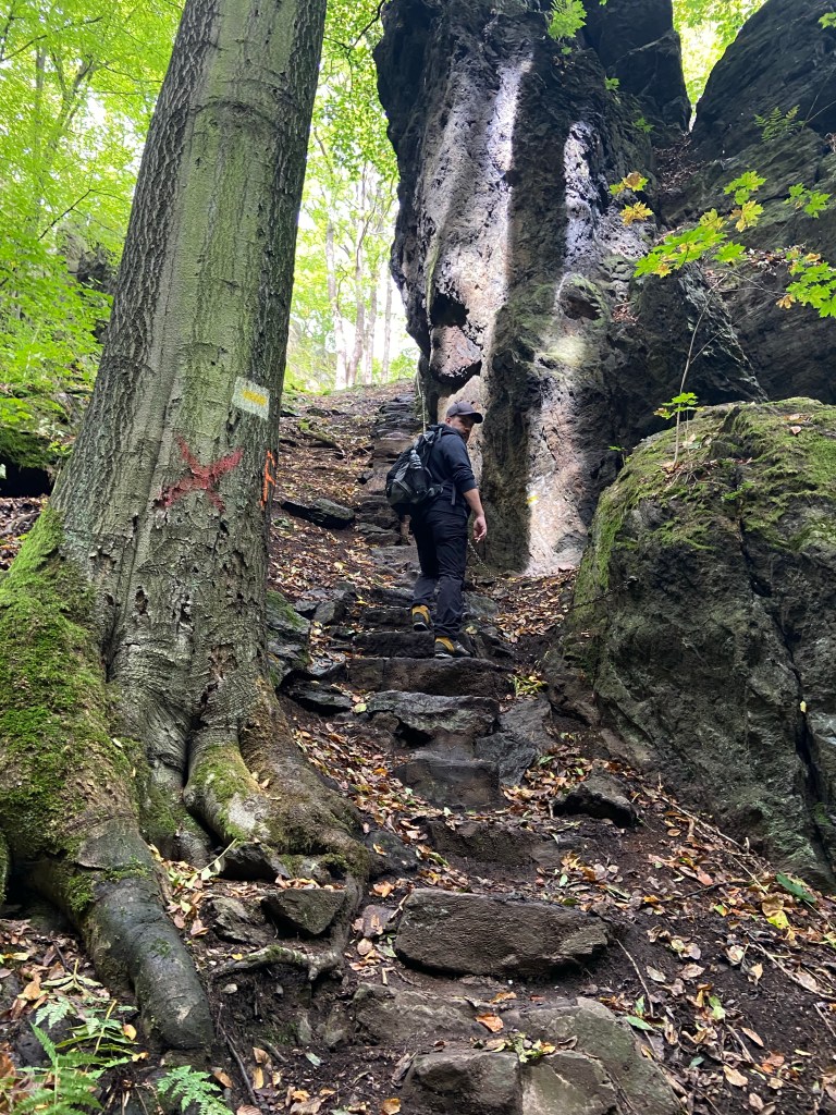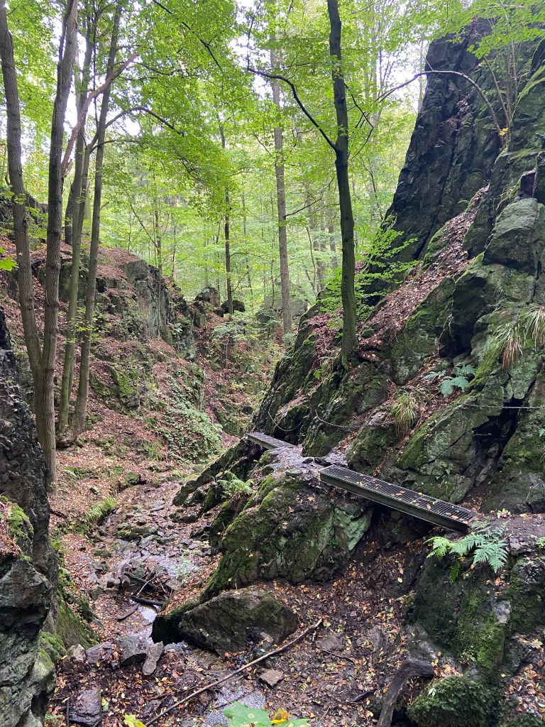 An der Somsdorfer Klamm angekommen erwartet uns ein schmaler Weg entlang eines Baches bergaufwärts. Über Stege und mit Drahtseil versicherten Stellen erklimmen wir die Klamm. Die Stege bringen meine Höhenangst ans Licht und treiben den Puls in die Höhe. Doch Zeit zum Erholen gibt es nicht. Steinerne Treppenstufen führen uns entlang der Teufelskuppe hinauf zur Teufelskanzel. Die Aussicht dort ist zwar durch den Bewuchs deutlich eingeschränkt, aber nach der kurzen Kletterpassage macht eine kurze Rast einfach Spaß.
