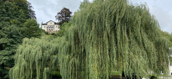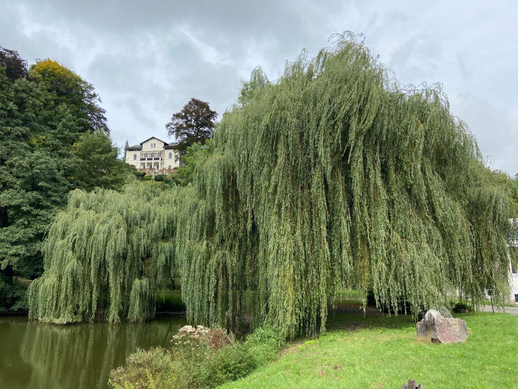 Von dort nehmen wir den Wanderweg S1 durch den Wald bergab Richtung Tharandter Schlossteich. Weiden lassen ihre Ästen in den Teich hängen und die Sonne spiegelt sich im Wasser, während im Hintergrund die Burgruine Tharandt zu sehen ist – ein schöner Anblick.