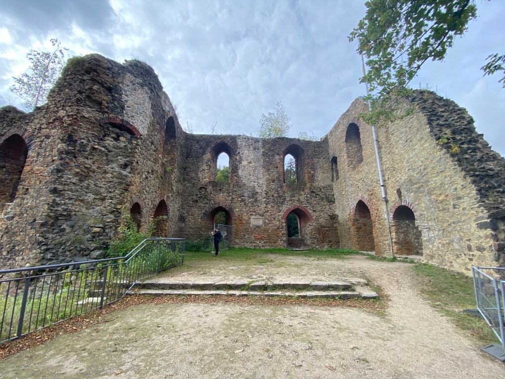 Entlang der Pienner Straße und Akademieweg geht es nun Richtung Treppenaufgang zur Burgruine Tharandt. Die Burgruine Tharandt ist eine Stätte der Burgenromantik des 19./20. Jahrhunderts und nur noch wenige bauliche Reste sind erhalten. Jedoch hat man von hier oben eine tolle Aussicht auf die umliegenden herbstlichen Wälder und die Stadt Tharandt. Neben der Burgruine befindet sich das Tharandter Schloss, bei welchem es sich um ein mehrfach umgebautes, romantisches Wohnschloss im Tudorstil aus dem 19. Jahrhundert handelt. Von außen wirkt es etwas heruntergekommen, fast schon wie ein Lost Place, aber es wird schrittweise saniert, was im Innern wohl inzwischen weitestgehend abgeschlossen ist.