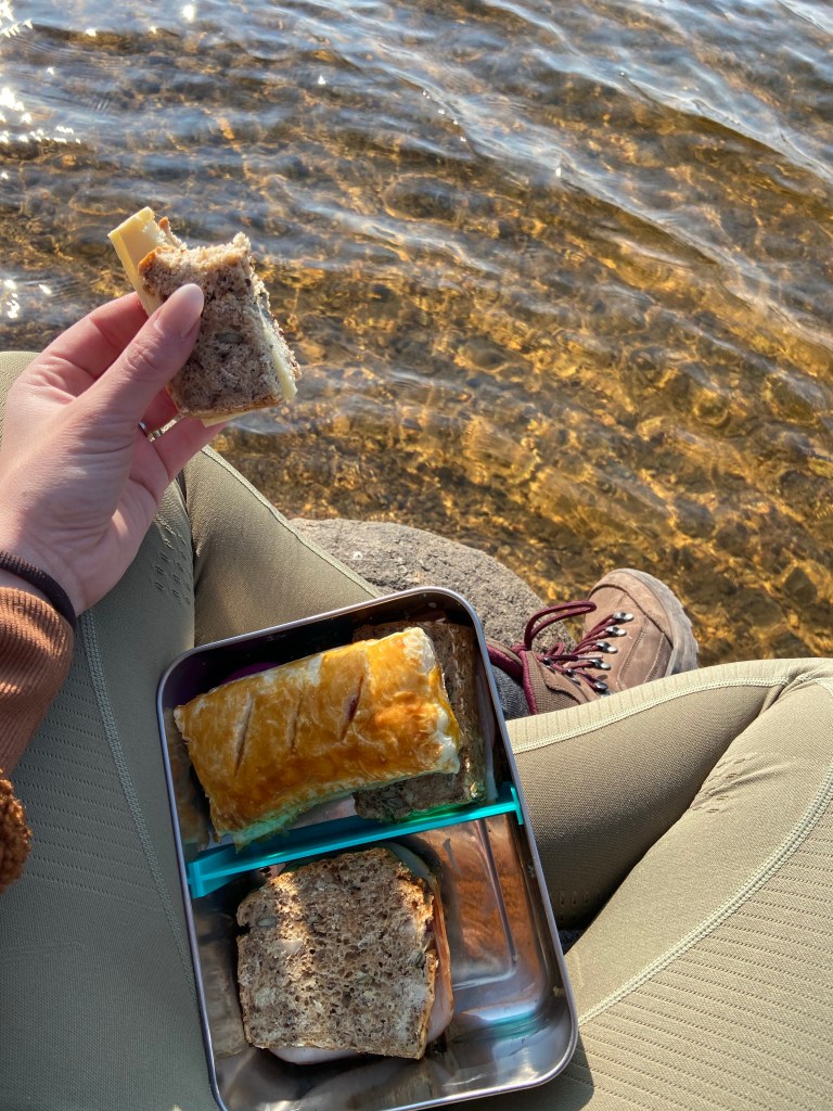 Am Hotel Auerhahn unterquere ich die B500 und wandere entlang der Nordseite des Schluchsees Richtung Muchenländer Brücke. Da ich noch nicht gefrühstückt habe, nutze ich das Ufer des Schluchsees für einen kurzen Zwischenstopp. Bei dieser herrlichen Aussicht auf das glitzernde Wasser, den Bergen rund um den See und der Sonne im Gesicht, schmeckt die Brotzeit gleich doppelt so gut. Um diese Uhrzeit ist es zudem sehr ruhig, lediglich die Vögel zwitschern munter vor sich hin.