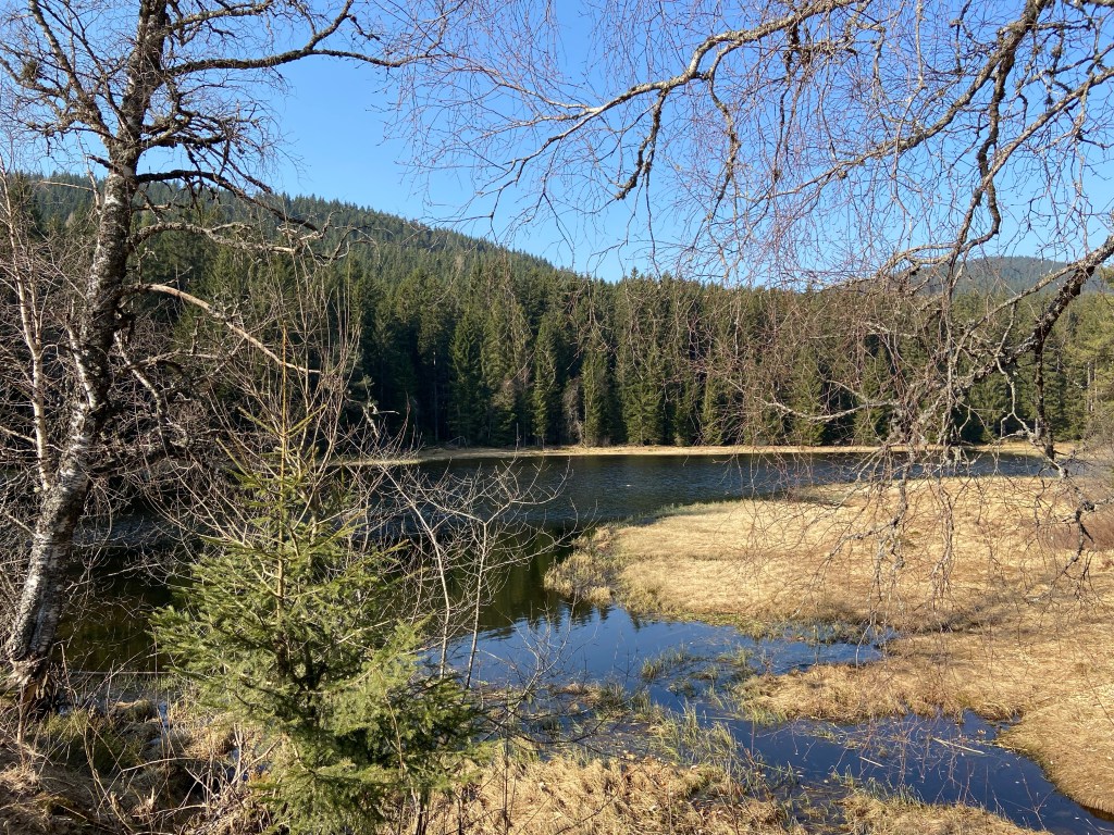 Langsam beginnt der Weg bergab zu gehen. Die Eis- und Schneeschicht auf den Wegen wird dünner, bis sie ganz verschwindet. An der ehemaligen Krummensäge führt mich ein breiter (schneefreier) Schotterweg Richtung Unterkrummenhof am Schluchsee.