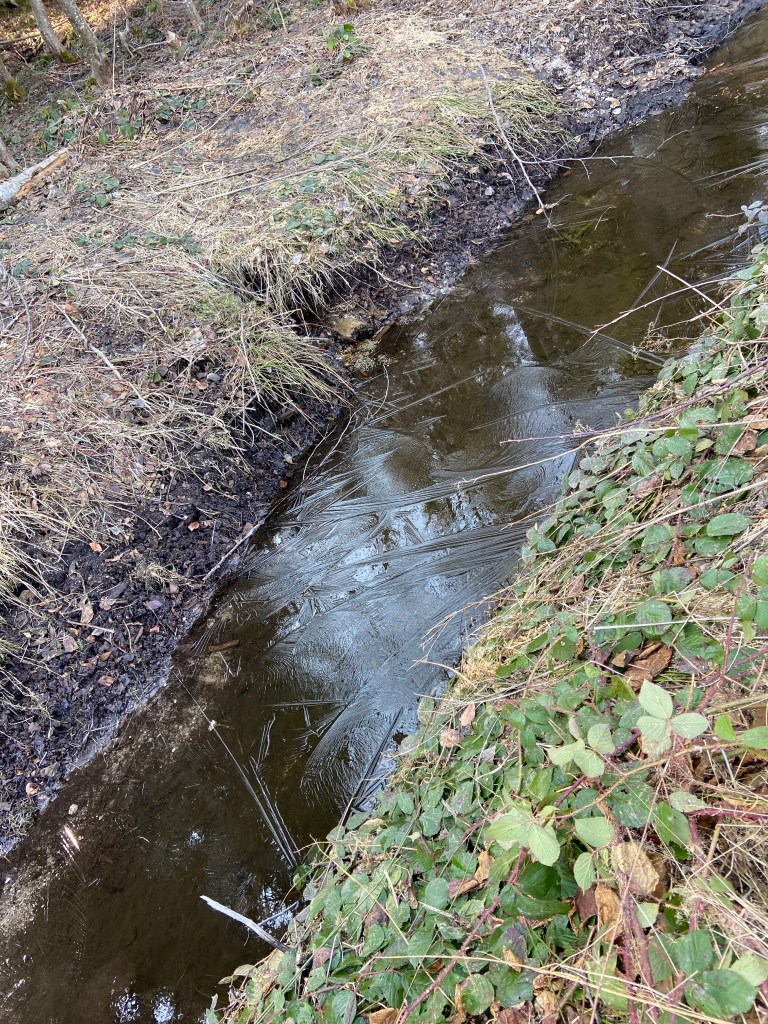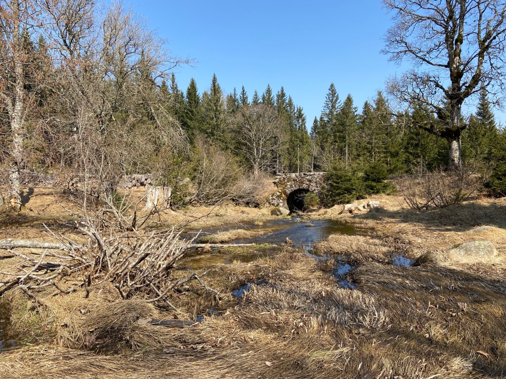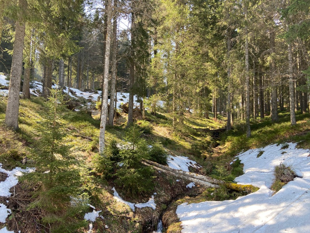 An der Muchenländer Brücke angekommen, gabelt sich der Weg. Ich nehme den rechten Forstweg und folge dem Wanderweg mit der gelben Raute Richtung Äule. Vereinzelte Schneefelder und ein gefrorener Bachlauf begleiten mit auf dem Weg, der inzwischen stetig bergauf führt.