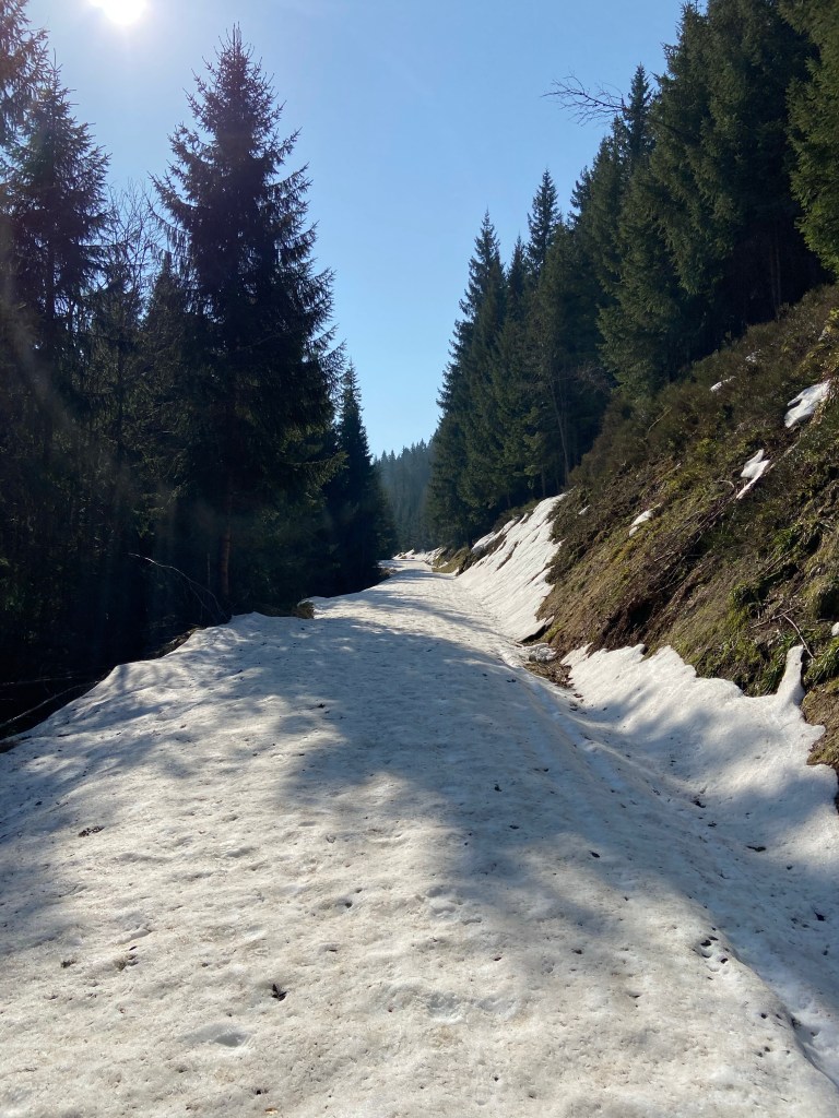 Ich folge nun dem Wanderweg mit der blauen Raute Richtung Rosshütte. Die Wegbeschaffenheit verbessert sich mit steigenden Höhenmetern leider nicht. Durch die warme Sonne tagsüber und den kalten Nächten, sind die Schneefelder teilweise stark vereist. Das Vorankommen gestaltet sich daher etwas langwierig.
