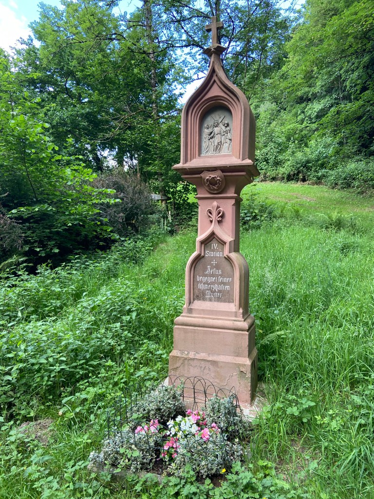 Der Weg zu unserem Etappenziel, der Giersbergkapelle, bildet ein Stationenweg. Entlang des Waldweges, finden sich seit 1897 ca. 2,5 Meter hohe Bundsandsteinstehlen in der Form eines Kreuzweges. Auf der Rückseite der Stehlen, finden sich Informationen zu den Spendern der Kreuzwegstationen.