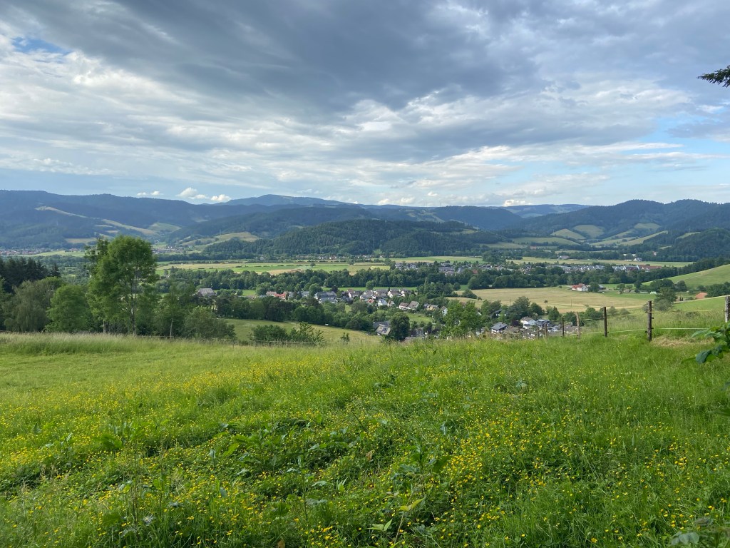 Nach ca. einem Kilometer erreichen wir unser erstes Etappenziel, der Wald gibt langsam den Blick auf die Giersbergkapelle und die dazugehörige Pilgergaststätte frei. Hier oben hat man einen herrlichen Blick nach Westen über Freiburg bis zu den Vogesen und dem Rosskopf mit den Windrädern. Im Nordosten sieht man die Pilgerkapelle „Maria Lindenberg“ bei St Peter.