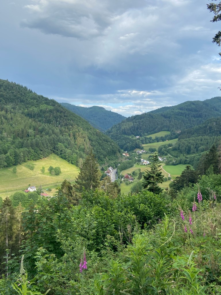 Am Parkplatz geht es bergwärts weiter der blauen Raute folgend Richtung Sonneck. Der anfangs strahlend blaue Himmel verfinsterte sich beim Aufstieg zunehmend. Leichtes Grollen kündigt ein Gewitter an. Kurze Zeit später fängt es an zu regnen, schnell in der Wanderkarte nach einem potentiellen Unterschlupf suchen. So ein Gewitter im Wald ist nicht ganz ungefährlich. Zum Glück blieb es bei einem warmen Nieselregen, die Regenjacke konnte im Rucksack bleiben.