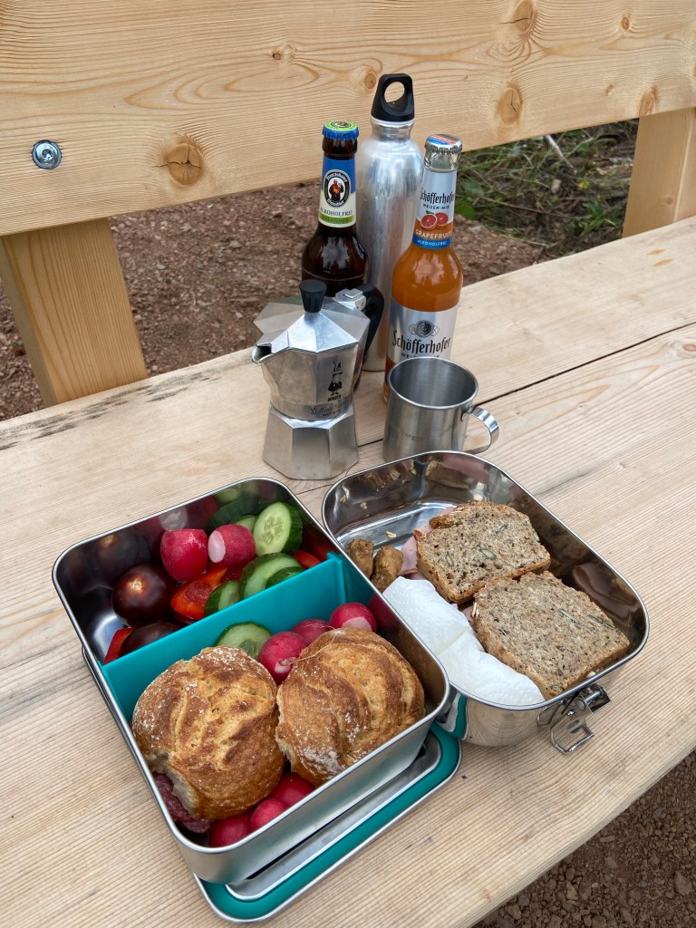 Am Wegpunkt „Am Sonneck“ wenden wir uns an der Wegespinne nach links und biegen auf den Weg mit der gelben Raute bergabwärts ab. Langsam wird es Zeit einen schönen Picknickplatz zu suchen. Nach ca. einem Kilometer haben wir ihn gefunden. Eine neu errichtete Holzbank mit wunderschöner Sicht auf das Örtchen Falkensteig. Die Butterbrotboxen mit belegten Brötchen, Rohkost und Eier sind schnell aus den Rucksäcken geholt. Sogar an einen kleinen Gasbrenner für eine Tasse Kaffee wurde gedacht. Mit Kaffee und alkoholfreiem Bier genießen wir unser Abendessen und beobachten den Verkehr, der sich durch Falkensteig das Höllental hinaufschiebt.
