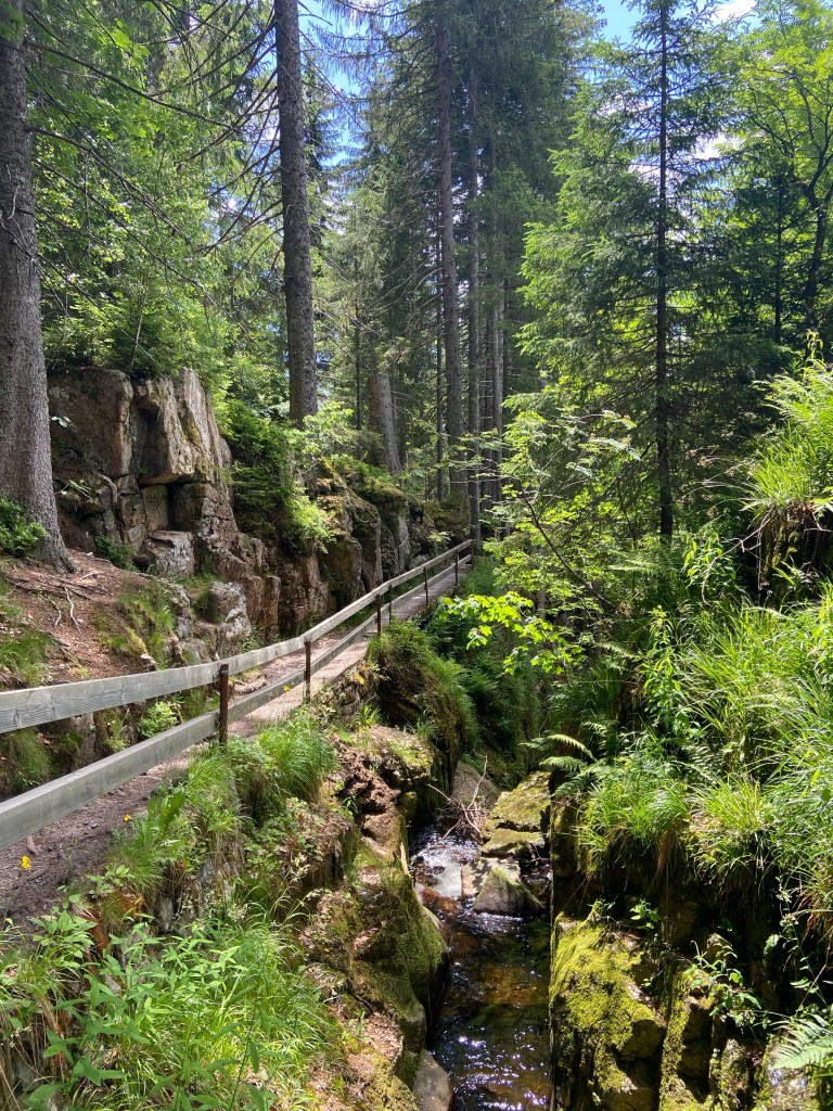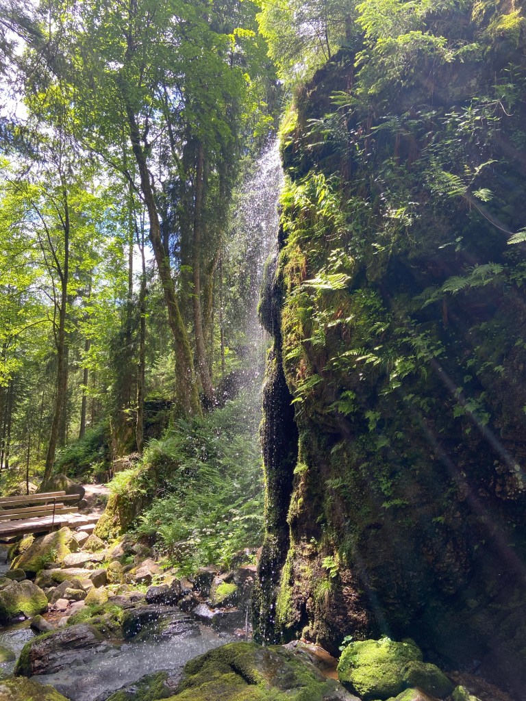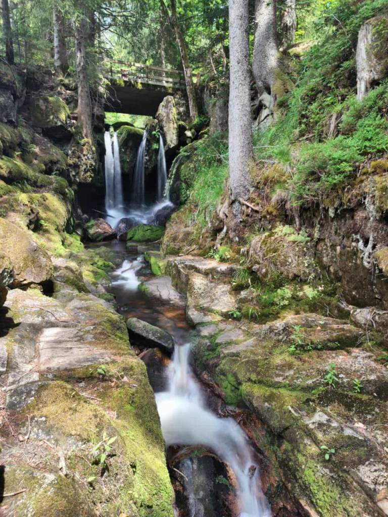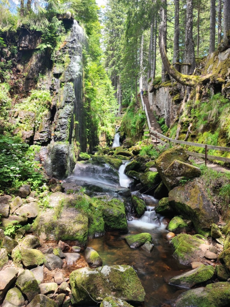 Etwas weiter des Wegen halten wir uns am Wegweiser „Albschlucht“ links und steigen über Treppen hinab in die enge Schlucht. Von weitem hören wir schon das Rauschen der Menzenschwander Wasserfälle. Die Menzenschwander Alb hat sich hier in einen harten Felsriegel aus Granitporphyr eingegraben und bildete mehrere Wasserfälle. Von der Seite der Schlucht stürzen sich diese in die Tiefe. Für einen kurzen Moment genießen wir den Anblick und die feinen Wassertropfen, die einen angenehmen kühlen Film auf der Haut hinterlassen und gehen anschließend weiter.