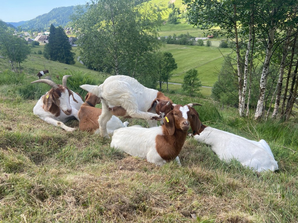 Vom Parkplatz aus gehen wir ein kurzes Stück an der Straße Richtung Hinterdorf von Menzenschwand. Hier passieren wir mehrere, teilweise liebevoll gestaltete und gut erhaltene alte Höfe und biegen links ab in den Schwarzenbergweg. Nach ein paar Metern geht die asphaltierte Straße in einen Pfad über. Links des Pfades befinden sich die ersten Ziegenweiden und die erste Herde ließ nicht lange auf sich warten. Seelenruhig liegen die Ziegen im Gras und lassen sich durch die vielen Wanderer nicht stören. Da die Tiere Menschen gewohnt und vor allem neugierig sind, kommen sie auch gerne mal an den Zaun und begutachten ihr Gegenüber.
