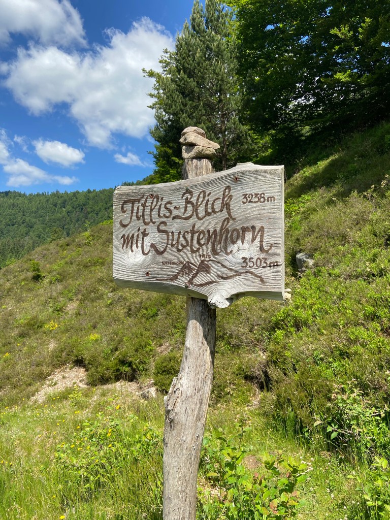 Nach dem Erreichen des höchsten Punkts der Wanderung führt uns der Weg durch eine Endmoräne des letztens Gletschervorstoßes vor der Warmzeit. Entlang Biotope und dem Klusensee erreichen wir unseren ersten Rastplatz. Von der Bank haben wir einen wunderschönen Blick in die Alpen. Die schneebedeckten Gipfel des Titlis (3.238m) und des Sustenhorns (3.503m), beide in den Urner Alpen gelegen, glitzern in der Ferne im Sonnenlicht. Wir machen es uns gemütlich und öffnen eine Piccoloflasche Sekt und stoßen auf die 50. Wanderung an. Cheers!