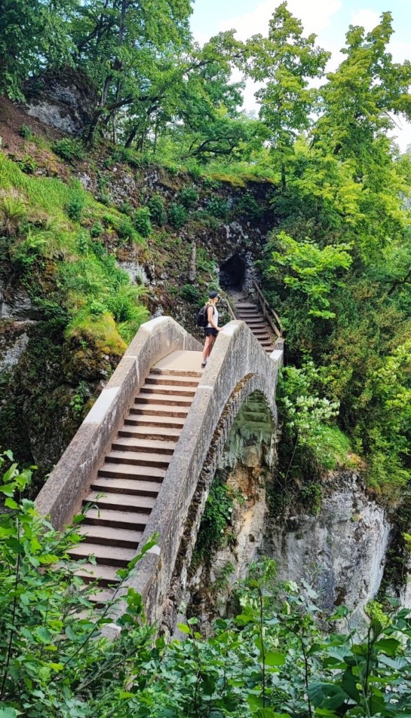 Wir folgten der Beschilderung weiter Richtung Teufelsbrücke. Langsam geben die den Weg umsäumenden Bäume den Blick auf die Brücke frei. Die Bauweise der Brücke ist wunderschön anzusehen. Markant spannt sich die Brücke auf einer Länge von 21,5 Metern über die Höll, eine 19,5 Meter tiefe Schlucht. Für diesen Abschnitt lohnt sich frühes Aufstehen, oder eine Menge Geduld, damit man die Brücke menschenleer photographieren und überschreiten kann.