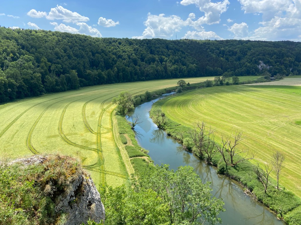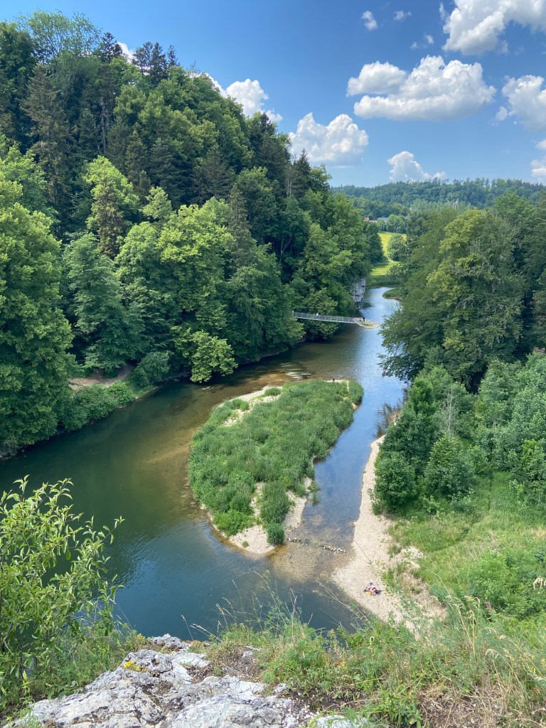 Durch einen Felsentunnel am Ende der Teufelsbrücke setzten wir unseren Weg Richtung Känzele fort. Die Aussichtsplattform Känzele ist ebenfalls Teil des fürstlichen Parks. Von hier haben wir eine schöne Aussicht auf die Donau, die hier träge durch ein Wiesental fließt.