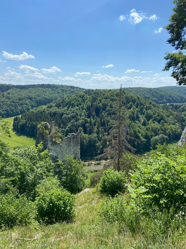 Weiter folgen wir der Beschilderung über den Wegweiser „Unterm Känzele“ zurück an den Fluss in Richtung des ehemaligen Bahnhofs Inzigkofen. Hier überqueren wir die Landstraße 313 und folgen dem schmalen Pfad hoch Richtung Scheuerlebühl. Dort biegen wir links nach Gebrochen Gutenstein ab. Die Burg gehörte einst dem Herzog Albert von Österreich und wurde 1354 erstmals urkundlich erwähnt. Schon bereits 1410 wurde die Burg als Ruine bezeichnet. Folglich ist, bis auf die Mauern des Wohnturms auf einer unzugänglichen Felsnadel, kaum mehr zu sehen. Mit Blick auf die Burgruine eröffnet der Weg einen weiteren Aussichtsfelsen, auf dem wir bei Sicht auf Gebrochen Gutenstein und dem darunterliegenden Donautal eine ausgiebige Rast einlegen und um Schatten der Bäume unsere mitgebrachten Vesperbrote verzehren.