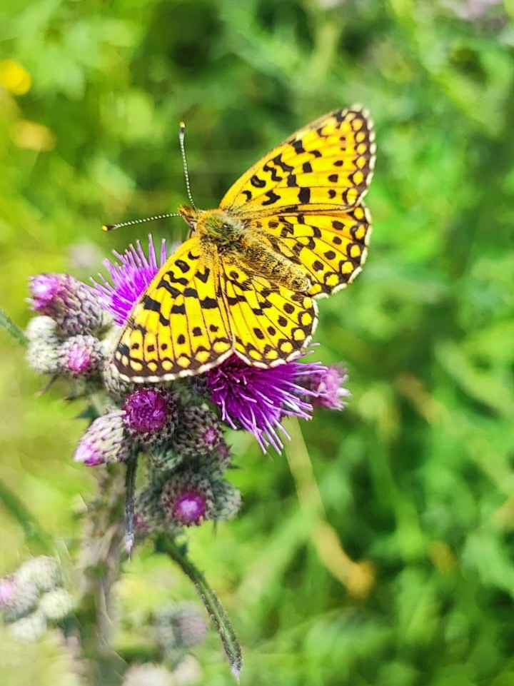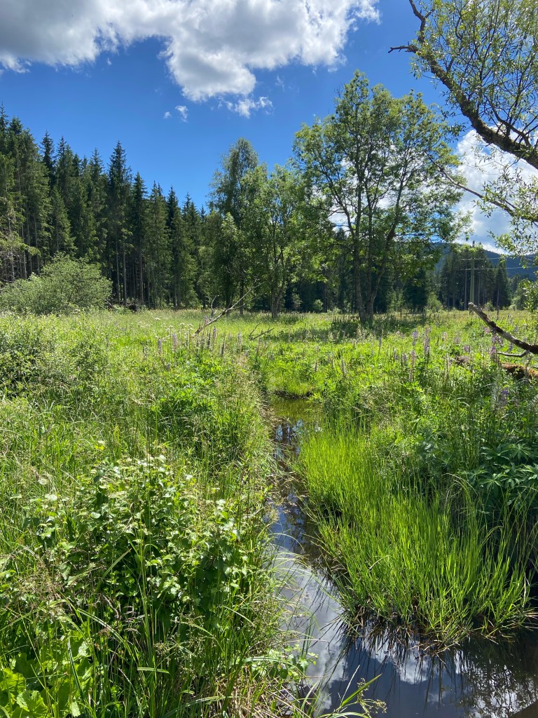 Am Landgasthaus Gemsennest passieren wir einen kleinen Entenweiher und setzen unseren Weg zu unserem nächsten Streckenziel, dem Windgfällweiher fort. Entlang mit Blumen durchzogener Felder, Sumpflandschaften und Kuhweiden, führt uns unser Weg zunächst am Minigolfplatz Falkau und anschließend dem Sportplatz vorbei, ehe wir wieder die Haslach überqueren und in ein Waldstück abbiegen. Der relativ breite Waldweg spendet angenehmen Schatten, denn inzwischen brennt die Sonne erbarmungslos vom Schwarzwälder Himmel. Nach ca. einem Kilometer haben wir den Windgfällweiher erreicht.