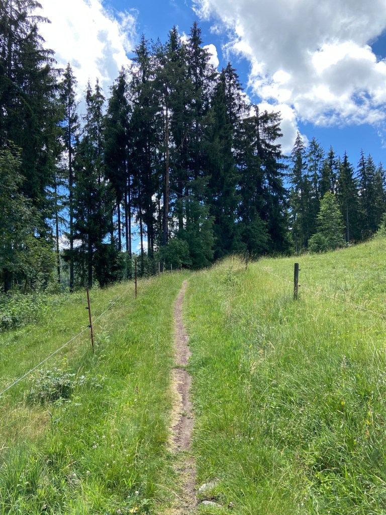 Nach ca. 3 Kilometern haben wir den Aufstieg hinter uns und befinden uns auf einem Wanderparkplatz an der L315. Dort überqueren wir die Landstraße und folgen der Wegbeschilderung Richtung Falkau. Entlang Kuhweiden führt uns der Weg durch Wiesen, ehe wir wieder den schattigen Wald betreten.