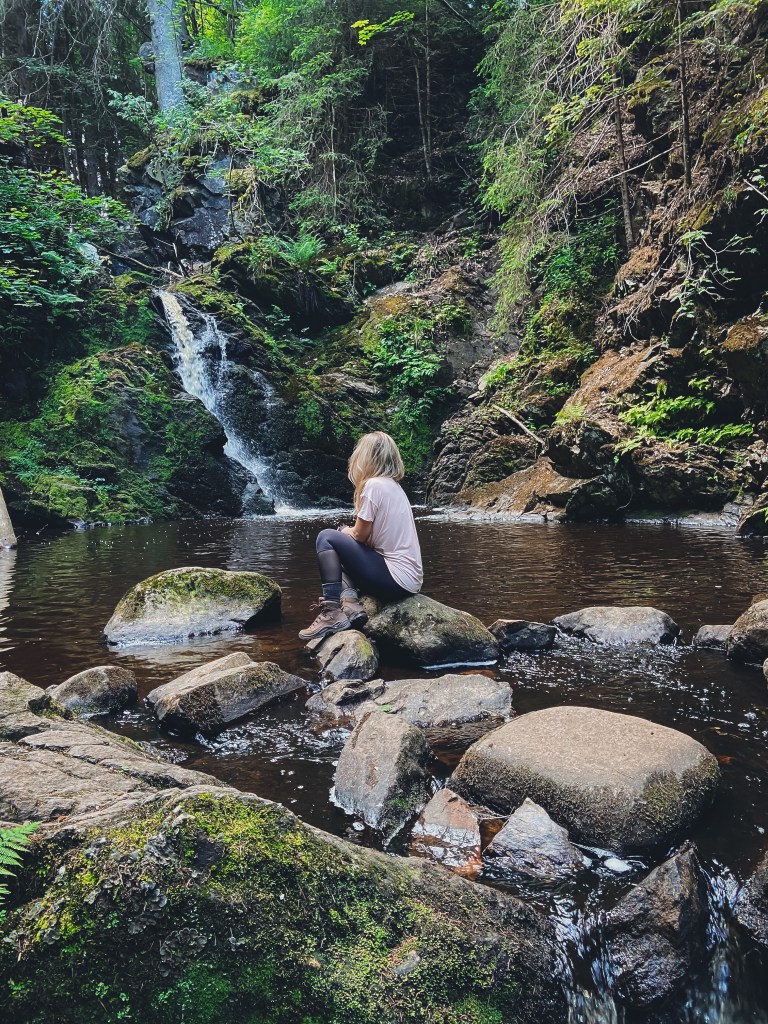 Unten in der Schlucht angekommen, kann man sich am spannenden Naturschauspiel erfreuen: Die Haslach stürzt hier über zwei Fallstufen hinab in ein großes Becken. Auf den großen Steinen vor dem Wasserfall hat eine Familie Platz genommen und genießt ihr Vesper und als die Brote gegessen und die Rucksäcke geschultert waren, waren wir ganz alleine. Traumhaft diese Stille und eine tolle Möglichkeit, die Kaskaden des Wasserfalls in aller Ruhe zu bestaunen und zu fotografieren.