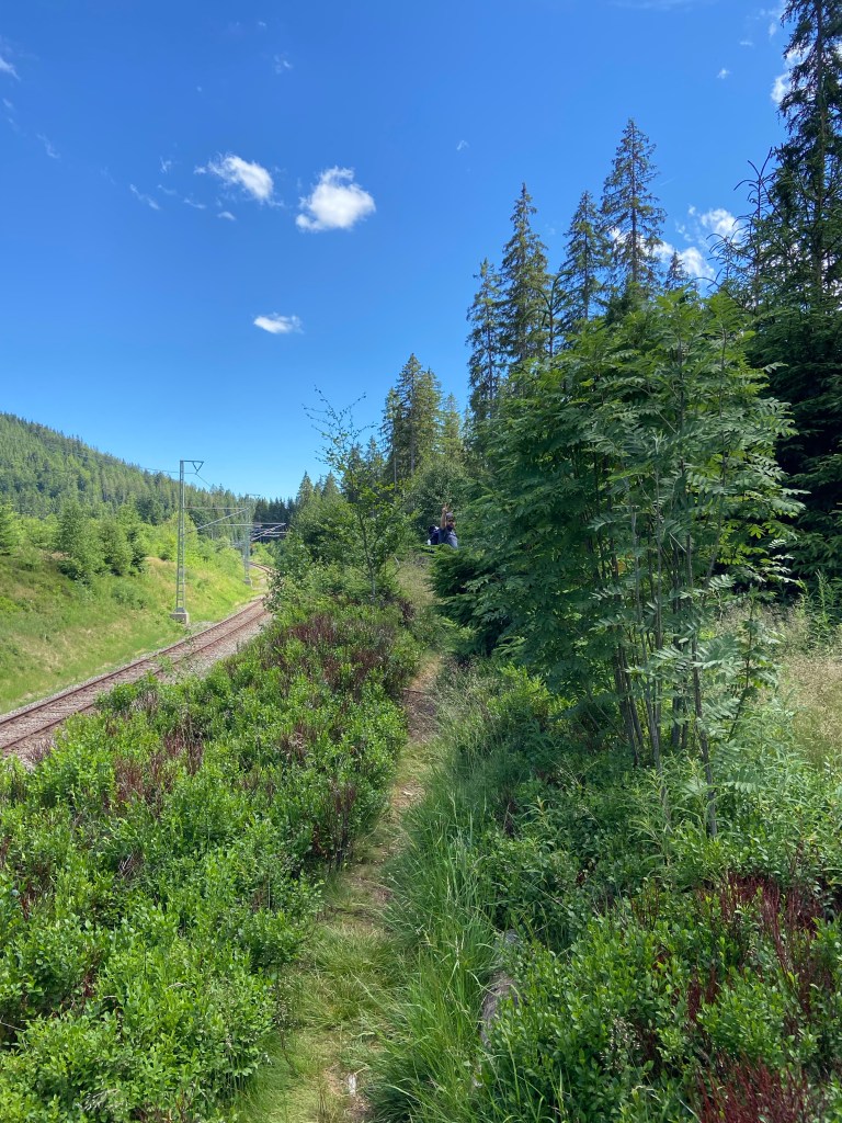 Unser Weg führt uns am nördlichen Ufer des Sees, immer entlang der Schienen der Drei-Seen-Bahn (Streckenabschnitt der Regionalbahn Titisee – Schluchsee), Richtung Schluchsee. Der schmale Pfad entlang der Gleisen ist dicht bewachsen und teilweise etwas matschig, was eine willkommene Abwechslung zu den ansonsten leicht begehbaren Wegen darstellt. Nur die Dornenranken sollte man im Auge haben, sonst sind Kratzer vorprogrammiert.