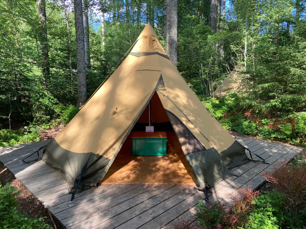 In Schluchsee führte unser Weg direkt ins Schwarzwald Camp, unsere Füße waren nach 16 Kilometern Fußmarsch mit schwererem Gepäck langsam müde. Im Schwarzwald Camp hat man die Wahl aus ganz verschiedenen Plätzen und Übernachtungsformen, welche sich auf einer Fläche von einem Hektar verteilen. So gibt es neben klassischen Zeltplätzen und Stellplätze für Bullis auch die Möglichkeit in Tipis, Baumzelten und einer Gondel zu übernachten.