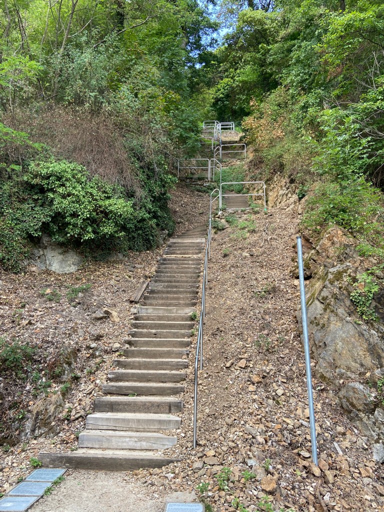 In Kehren verläuft nun der Weg durch den Wald hinauf zur Burghaldering und dem dort befindlichen Kleinen Kanonenplatz. Wendet man seinen Blick vom Kleinen Kanonenplatz in Richtung Schlossberg, erblickt man eine große Treppenanlage. 265 Stufen und 13 Zwischenpodeste heißt es nun zu erklimmen. Nach einem schweißtreibendem Aufstieg erwartet den Wanderer der 35 Meter hohe Schlossbergturm. Der Turm verfügt über drei Aussichtsplattformen, auf deren oberste man über eine kleine Wendeltreppe gelangt. Sie ermöglicht einen Panoramablick über die Stadt Freiburg und ihre Umgebung.