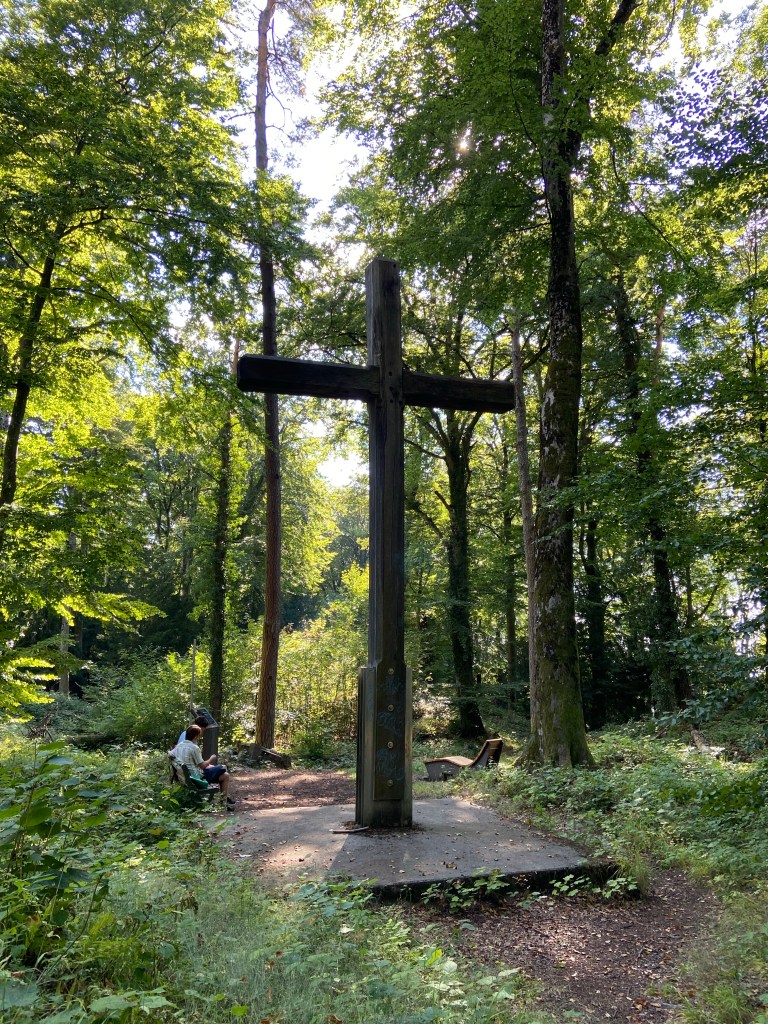 Wir halten uns gerade und passieren einen Felseinschnitt, um dahinter einen Trampelpfad vorzufinden. Auf diesen biegen wir in rechter Gehrichtung ab. Nach ca. 50 Metern entdecken wir eine weitere Sitzbank, mit imposanter Sicht auf den Freiburger Stadtteil Wiehre. Hier halten wir uns links und gelangen zum hinteren Ende der alten Fortanlage, mit weiteren Sitzmöglichkeiten und einem weitreichenden Blick ins Dreisamtal. Der Weg verläuft hier in einem weiten Bogen um den Gipfel des Schlossbergs herum. Kleine Wege führen zum Gipfelkreuz, ein Abstecher lohnt sich.