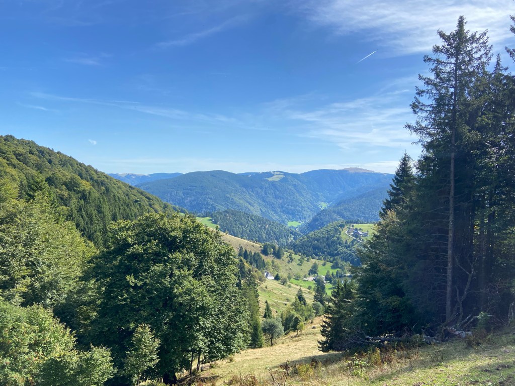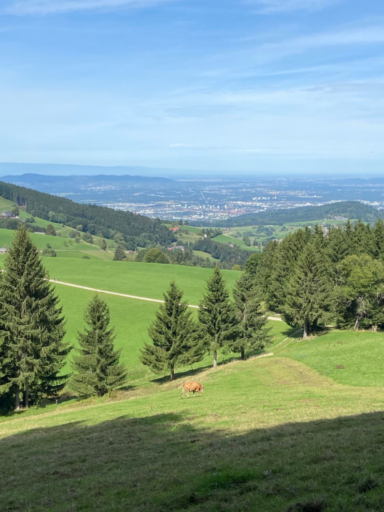 Auf dem schmalen Pfad geht es in Kehren hinunter zur Gießhübelstraße. Wir überqueren diese und nehmen einen weiteren schmalen Pfad zur Wegverzweigung „Unteren Sailendobel“. Hier halten wir uns links und folgen dem Richtung Gießhübel abzweigenden Weg. Nun geht es bis zum Wegweiser „Am Kaltwasserwald“, wo wir rechts Richtung Freiburg laufen. Von hier gelangen wir zu Eduardshöhe, welcher wir entlang Richtung Parkplatz Gerstehalm laufen. Bei der Eduardshöhe handelt es sich um einen unbewaldeten Bergsattel auf einer Höhe von 859 Metern. Von hier oben bietet sich eine tolle Aussicht Richtung Freiburg, der Rheinebene und sogar den Vogesen. Einfach traumhaft.