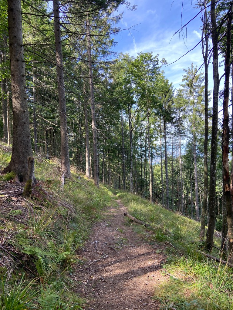 Am Wanderparkplatz Schlittenlift überqueren wir die Straße und biegen auf einem Pfad Richtung Berghaus Freiburg ab. Der Weg führt hinter dem Hotel hinein in den Wald. Wo um den Gipfel noch reges Treiben geherrscht hat, empfängt uns hier eine angenehme Ruhe. Man hat fast das Gefühl, vom Wald geschluckt zu werden.