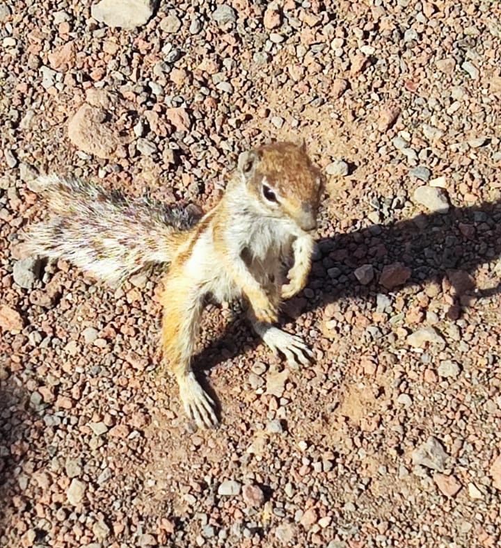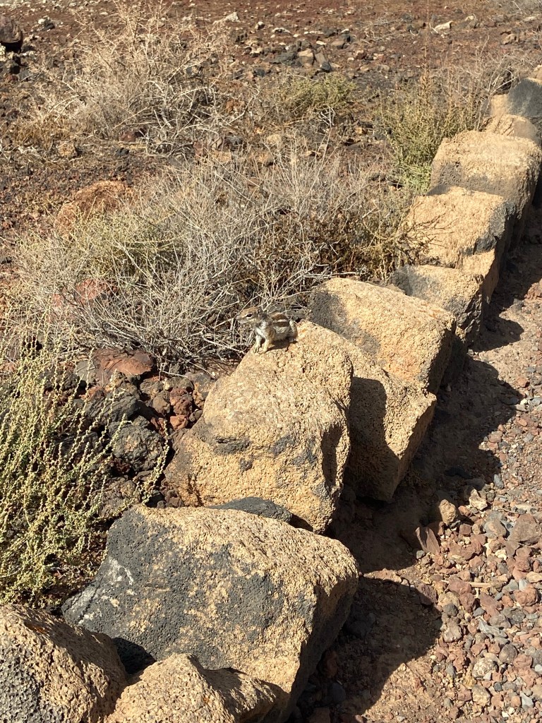 Am Fuße des Calderón Hondo angekommen, wird es Zeit den Sonnenschutz aufzufrischen. Die Sonne scheint hier gnadenlos auf die Natur und den sich dort befindlichen Lebewesen herab. Schatten ist absolute Fehlanzeige. Auf unsere Pause und dem Herabsetzen des Rucksacks scheinen die Atlashörnchen nur gewartet zu haben. Blitzschnell sind wir von einer Traube aufdringlicher Nager umgeben. Bettelnd umgarnen sie mit ihrem putzigen Aussehen und ihrer zutraulichen Art die Wanderer. Bei uns stoßen sie jedoch auf Granit. Ganz wichtig: Auch wenn die Landschaft noch so karg und trocken ist, bitte füttert keine Atlashörnchen! Auf Fuerteventura gelten die Nager als Schädlinge für die Landwirtschaft sowie als Bedrohung für heimische Tiere und Pflanzen. Durch das Füttern steigt die Population immer weiter an und verstärkt diese Probleme.