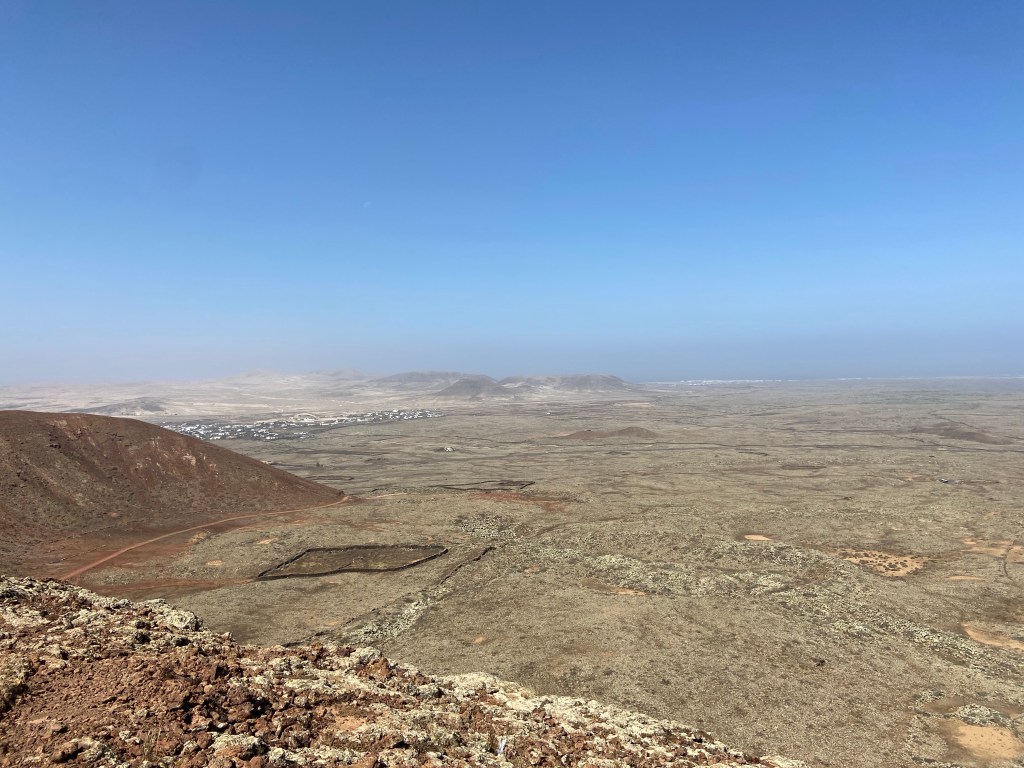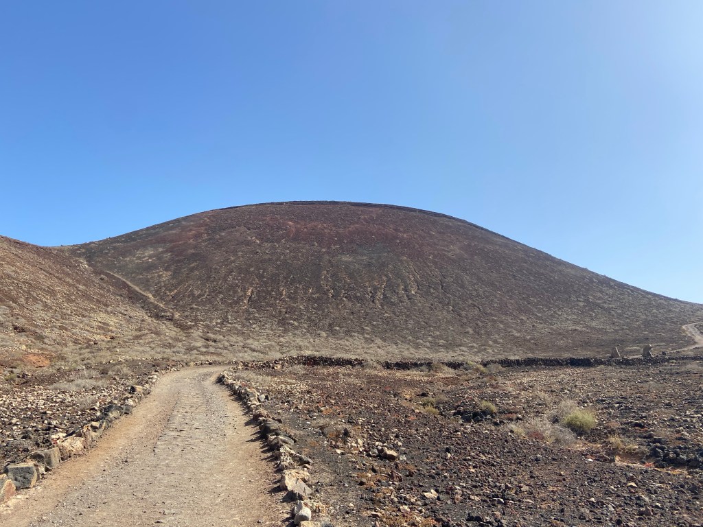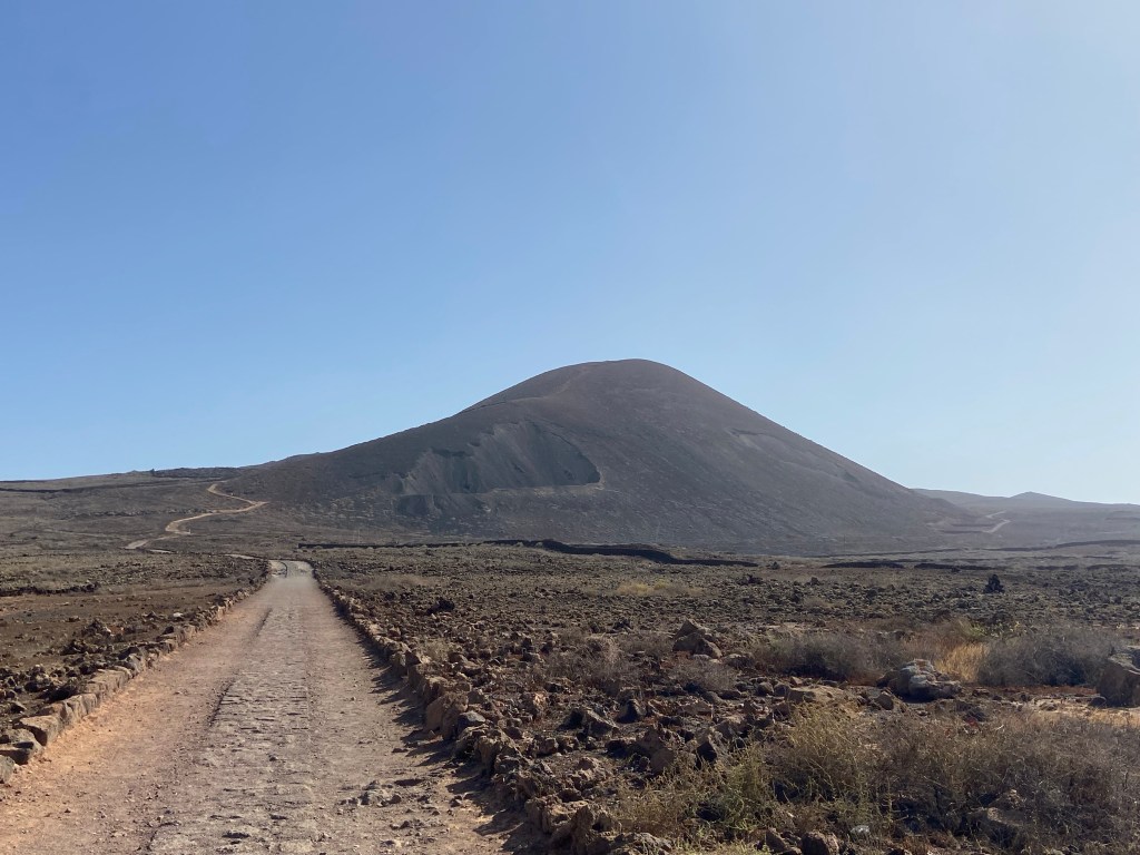 Nachdem wir uns aus den Fängen der Atlashörnchen befreit haben, es war dezenter Körpereinsatz notwendig (keins der Tiere wurde verletzt oder getroffen), setzen wir unseren Weg auf dem GR 131 in Richtung Corralejo fort. Auf linker Seite der Piste befinden sich hier inmitten der weiten Lavawüste einfache Gehöfte sog. Cotos Tamboriles. Der Weg auf der staubigen Piste ist wenig spektakulär und wir freuen uns daher umso mehr, als unser nächstes Wanderziel, der 271m hohe Bayuyo in unser Sichtfeld rückt.