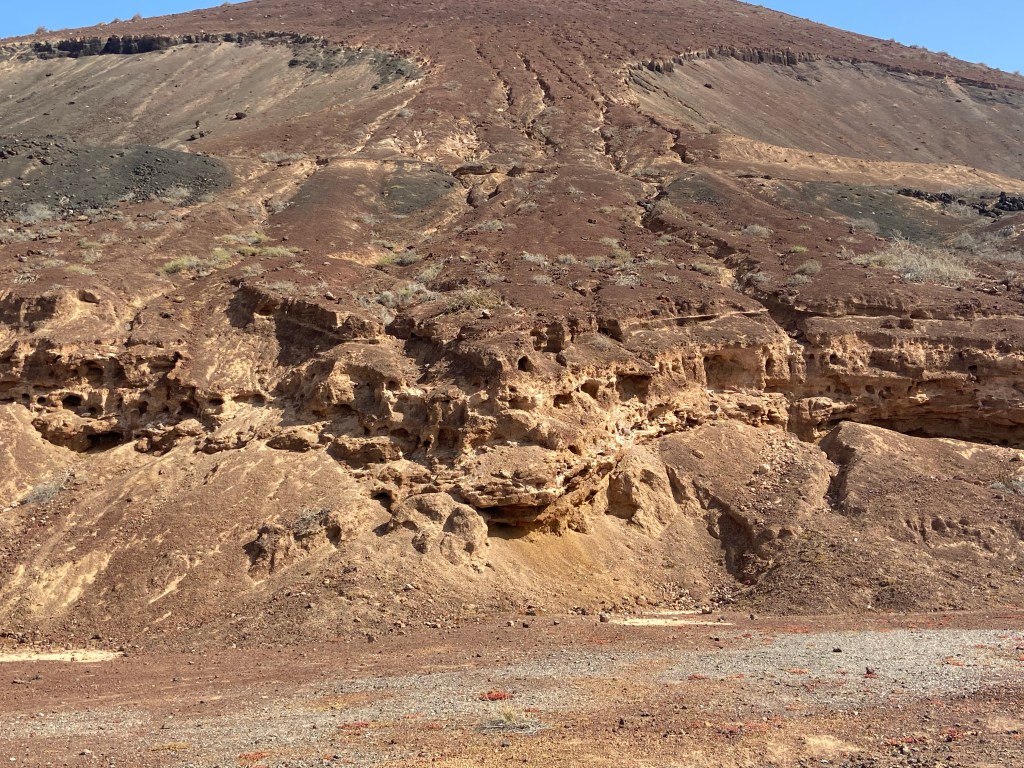 Wir folgen dem Weg in Richtung Calderón Hondo, unserem ersten Wanderziel. Der Weg führt uns zunächst genau auf die Montaña Colorada zu. Am Fuße des Berges befindet sich eine Abzweigung, an welcher wir uns rechts halten. Auf diesem Wege umlaufen wir die Montaña. An der Bergflanke erkennen wir kleine Vogelnester, die direkt in den Stein gebaut wurden. Unseren kurzen Halt zum Beobachten der kleinen Vögel ist nicht unentdeckt geblieben. Atlashörnchen nähern sich uns in flinken Bewegungen. Die kleinen Nager kamen in den 1960er-Jahren aus Nordafrika auf die Insel und haben sich mangels natürlicher Fressfeinde schnell verbreitet. Wir knipsen noch ein Foto mit dem Neugierigsten aus der Gruppe und setzen unseren Weg fort.