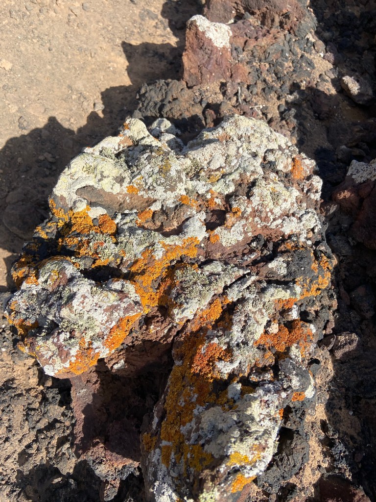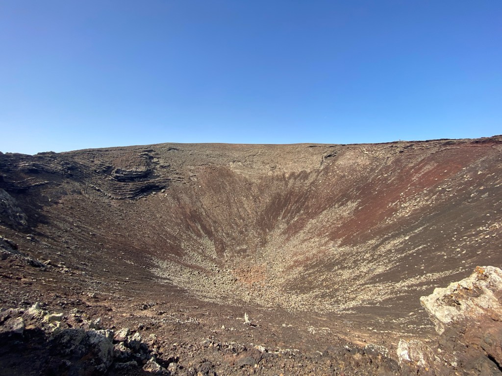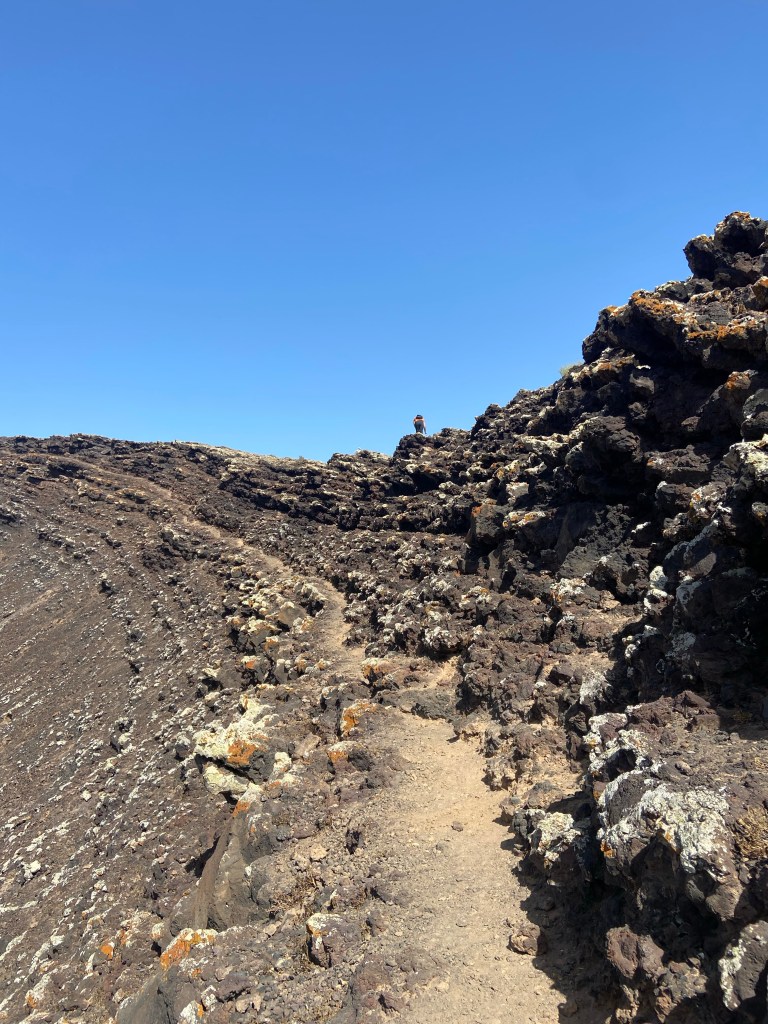Der Abstieg erfolgt auf einem gerölligen, aber gut ausgetretenen Pfad. Hier sind nochmal Trittsicherheit und Aufmerksamkeit gefragt. Auf dem Weg hinab, kann man in den Krater der benachbarten Montaña San Rafael blicken. Auf dem Boden des Kraters scheint es so, als habe die Natur ein Herz in den rauen Untergrund gemalt.