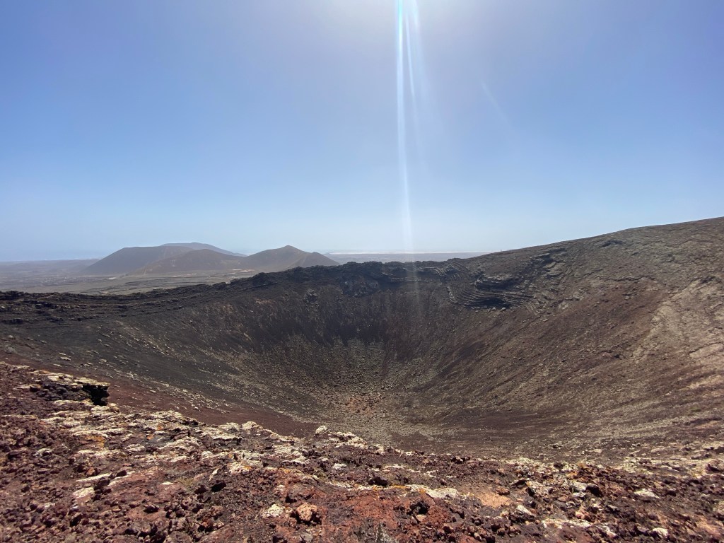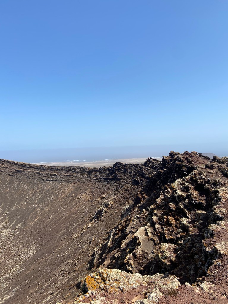Schon kurz darauf entdecken wir die rötlich schimmernde, mächtige Kuppe des Calderón Hondo. Ein schmaler, steiler und bei der Sonne schweißtreibender Aufstieg bringt uns an den Kraterrand des spektakulären Vulkans. Oben angekommen finden wir eine Aussichtsplattform, welche einen imposanten Einblick in den Kraterkessel bietet. Zwischen dem dunkelrötlichen Gestein erblicken wir in der Nähe des Kraterrandes gelbliche Schwefelablagerungen. Spannend, so etwas sieht man sonst bloß in Dokumentationen oder auf Fotos. Wir entscheiden uns, den Krater einmal zu umrunden. Hierzu führt ein kleiner, schmaler Weg teils im Krater und teils am Kraterrand um den Vulkan herum. Trittsicherheit ist hier gefragt, ebenso sollte es nicht allzu stark winden. Heute fegt der Wind großzügig über den Krater hinweg und wir müssen uns gelegentlich richtig in den Luftstrom stellen, um nicht hin und her zu schwanken. Bei der Umrundung genießen wir dennoch den wunderschönen Ausblick auf Lanzarote und die kleinen Siedlungen, welche sich an der Küste des Atlantiks reihen.