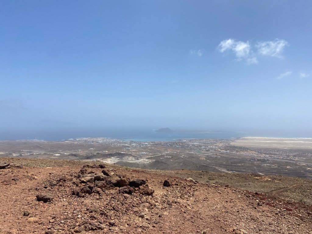 Steinmännchen markieren am südlichen Kraterrand die Aufstiegsroute. Mit jedem Meter bergauf öffnet sich die Sicht auf den Vulkan. Oben angekommen, entdecken wir einen runden Vermessungspunkt und wenige Meter nebenan, befindet sich der eigentliche Gipfel des Bayuyo. Von hier oben hat man eine herrliche Sicht auf den ganzen nördlichen Teil Fuerteventuras, mit unserem Zielort Corralejo, den großen Wanderdünen und die kleinen Ortschaften rund um den Berg. Ebenso im Blick hat man die Nachbarinseln Lobos und Lanzarote. Der Wind, der über den Gipfel des Bayuyo kräftig hinweg weht, sorgt kurzfristig für angenehme Kühlung, steht die Sonne inzwischen bereits im Zenit.
